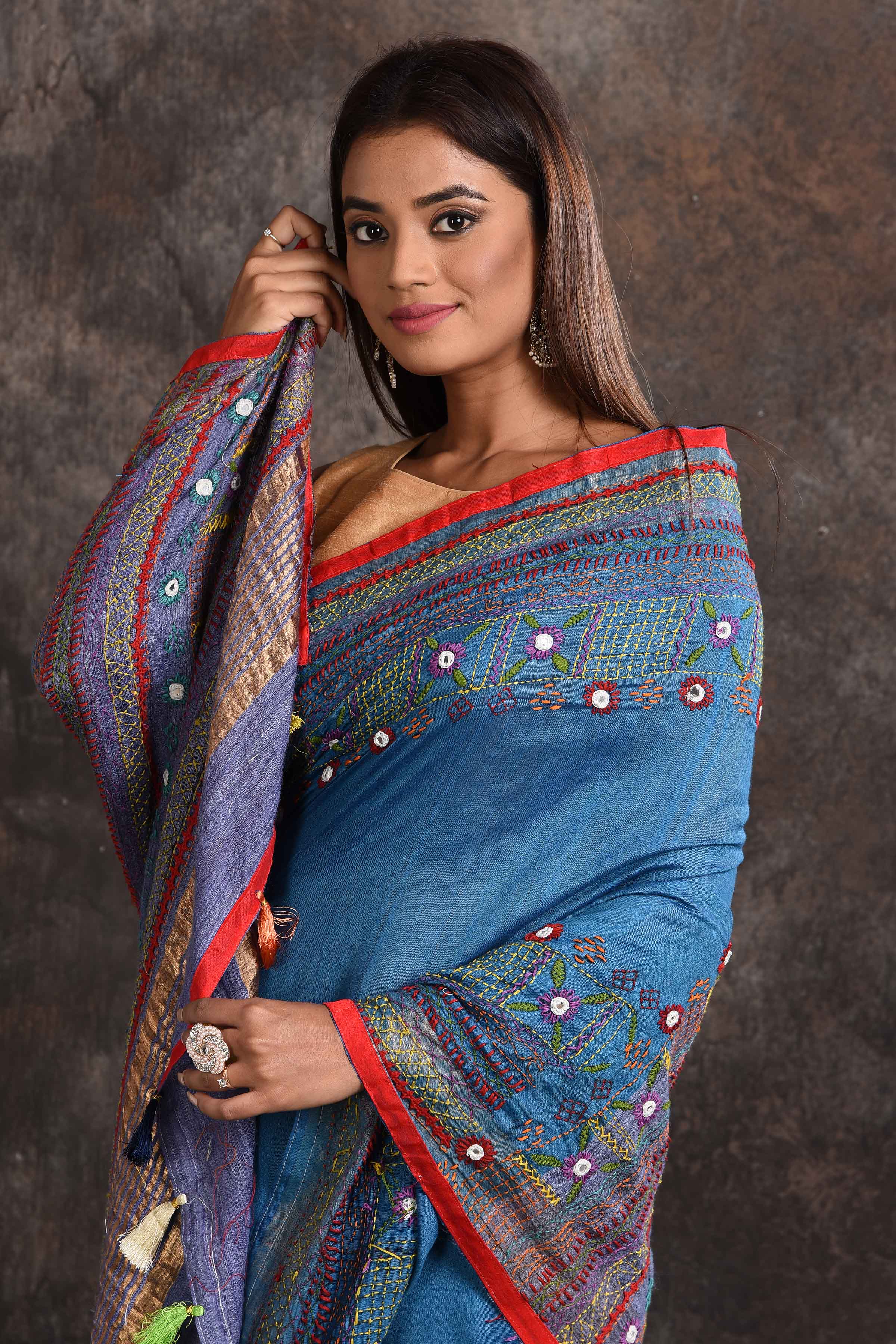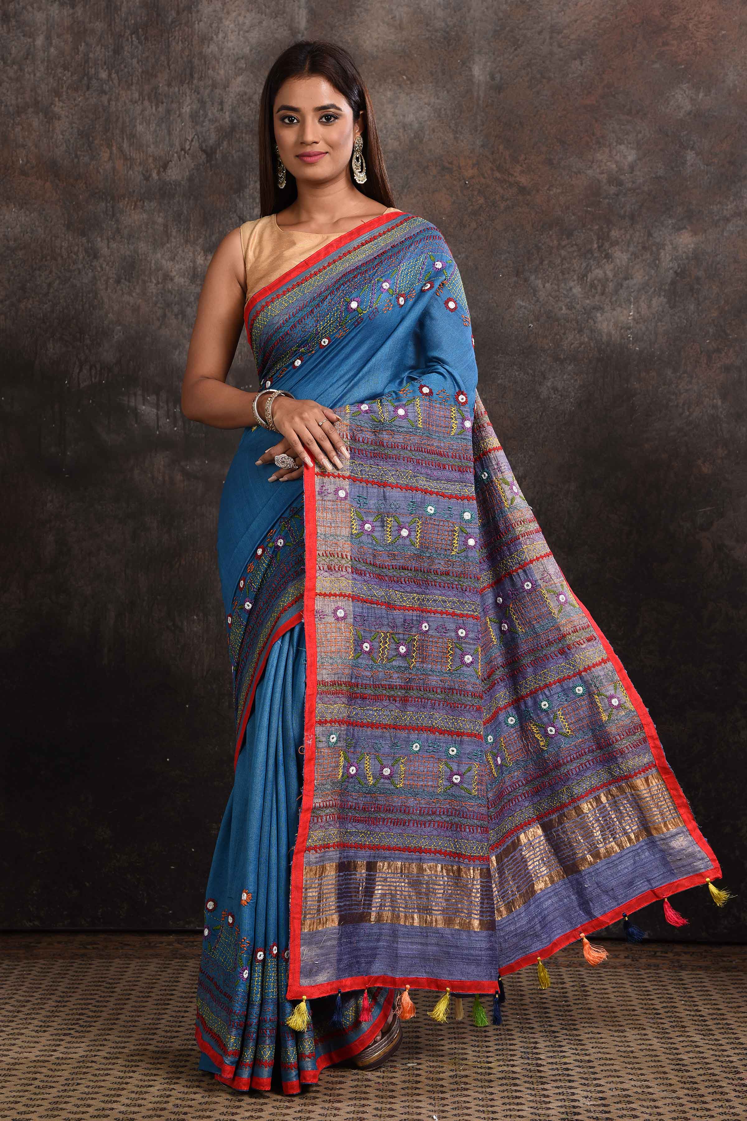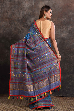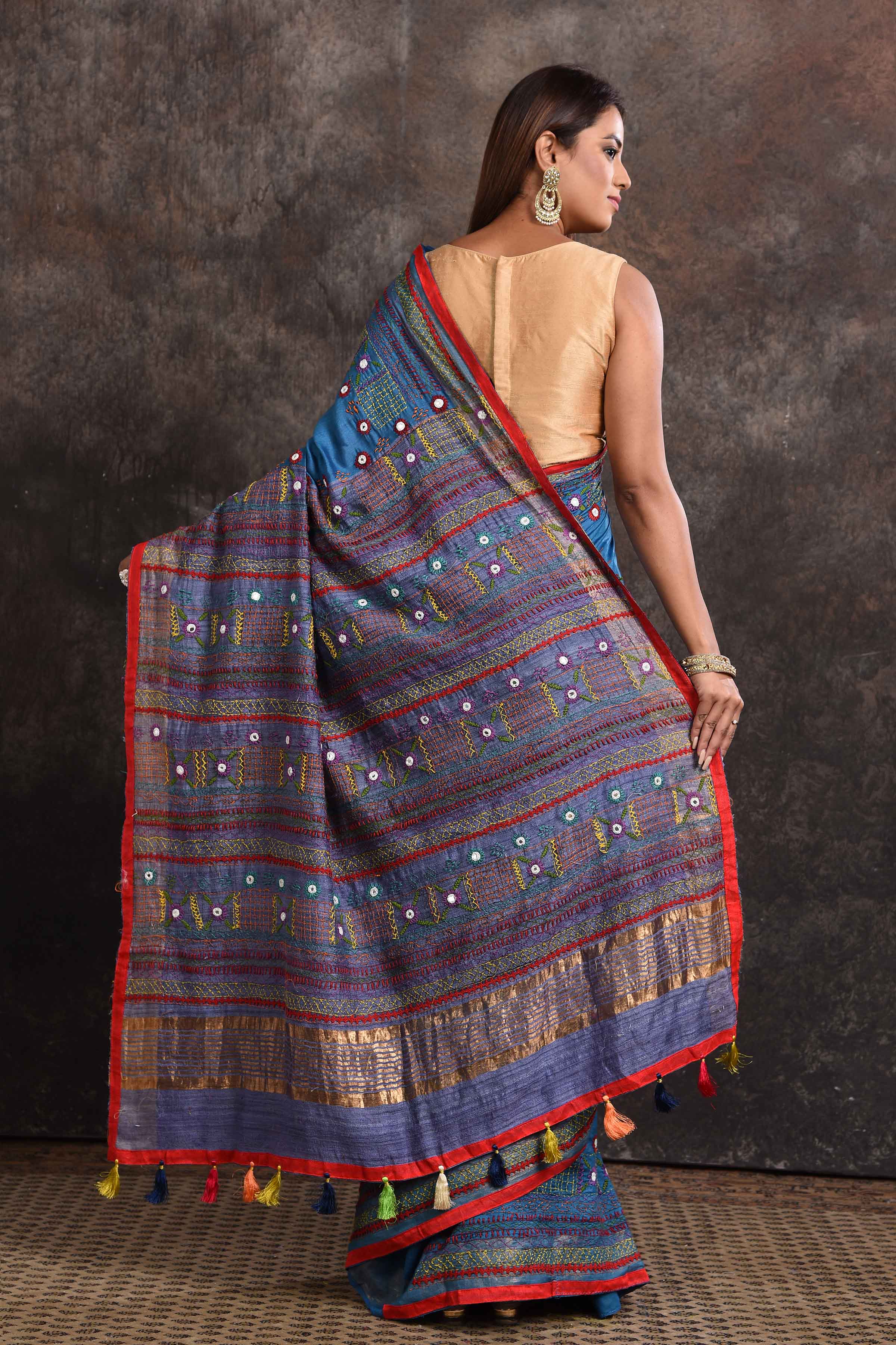 Beautiful blue Gicha tussar Lambani saree is a perfect drape for festive occasions. It comes with a matching blouse piece.