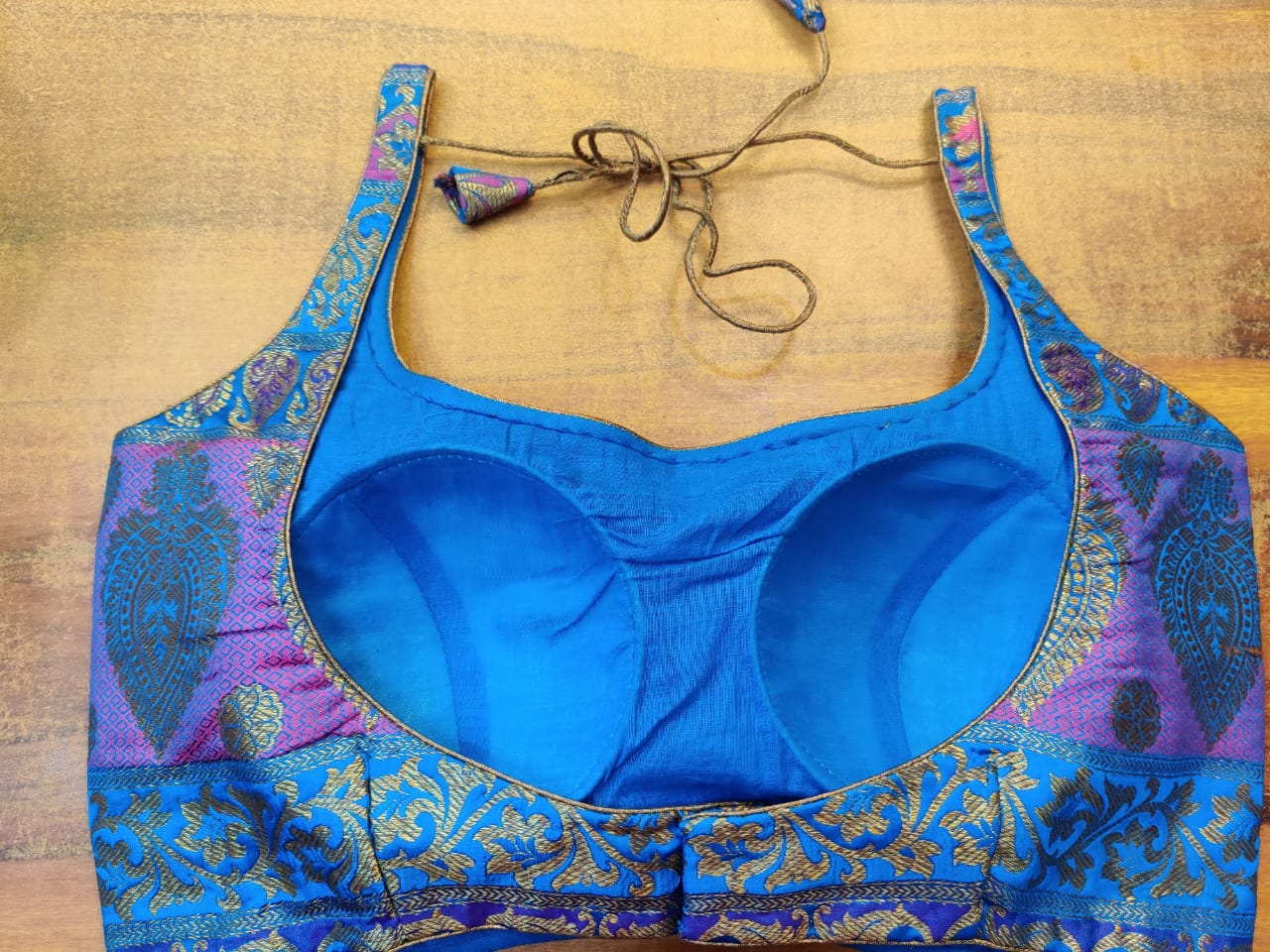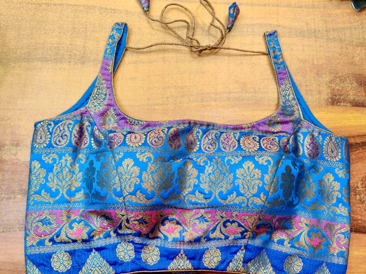 Stunning blue sleeveless Banarasi saree blouse. Buy online from Pure Elegance