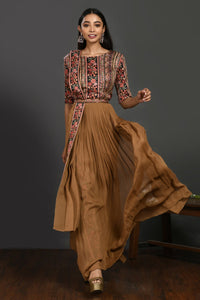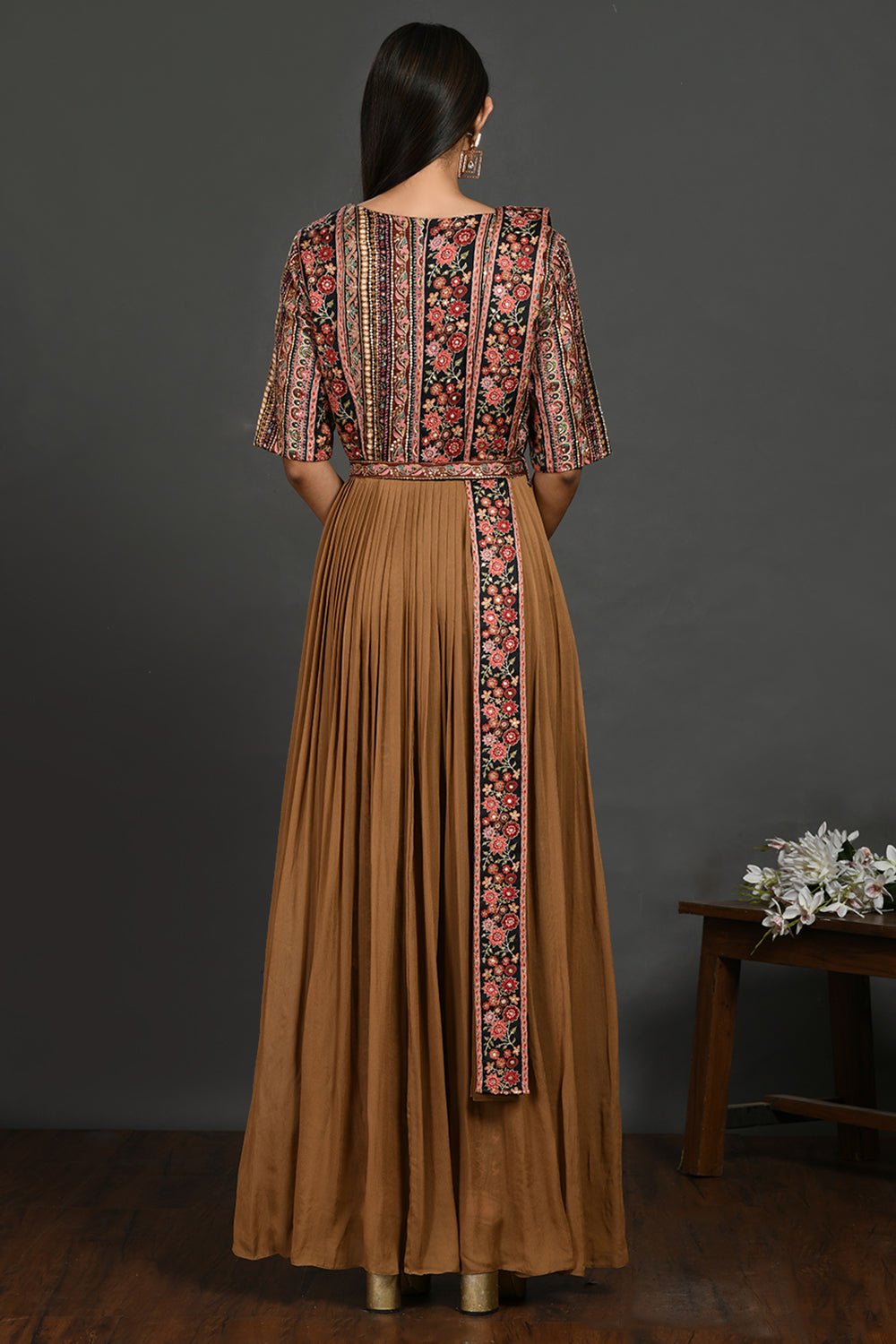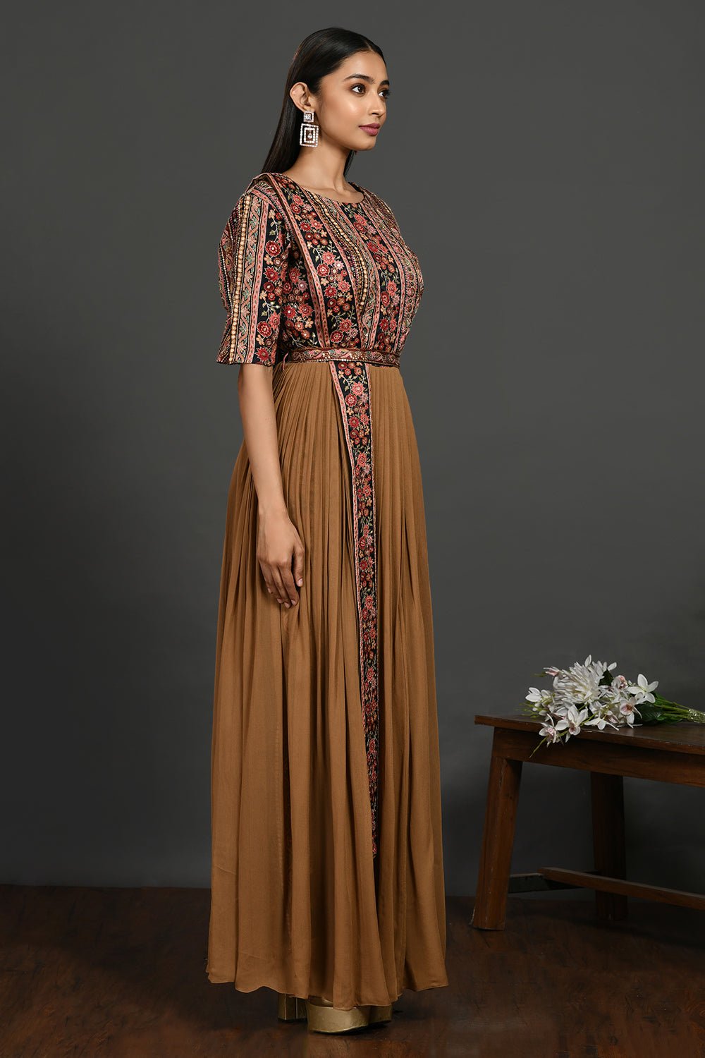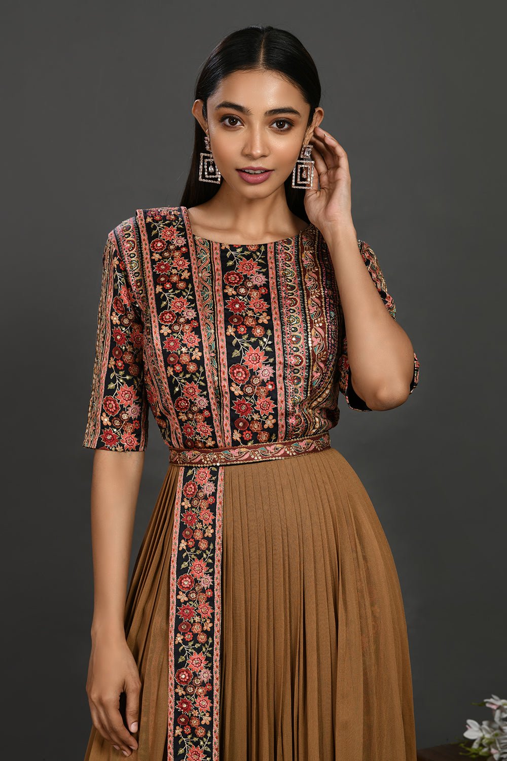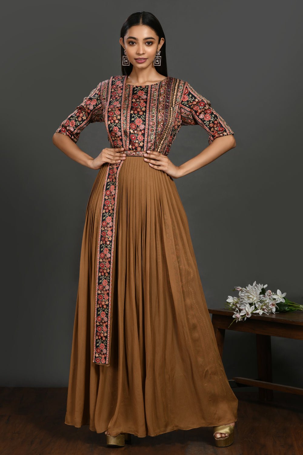 Beautiful brown maxi dress with printed bodice is a perfect pick for parties and festive occasions! Shop online from Pure Elegance.