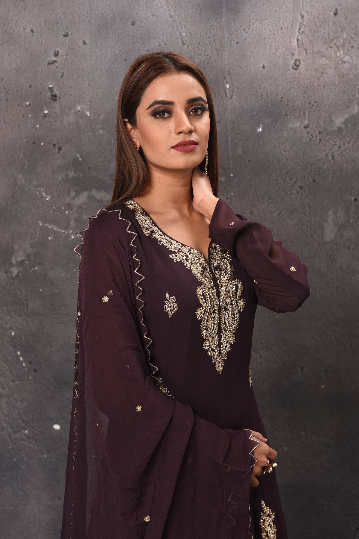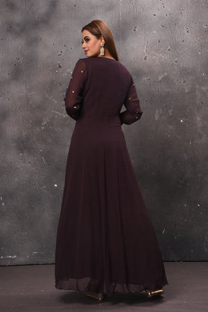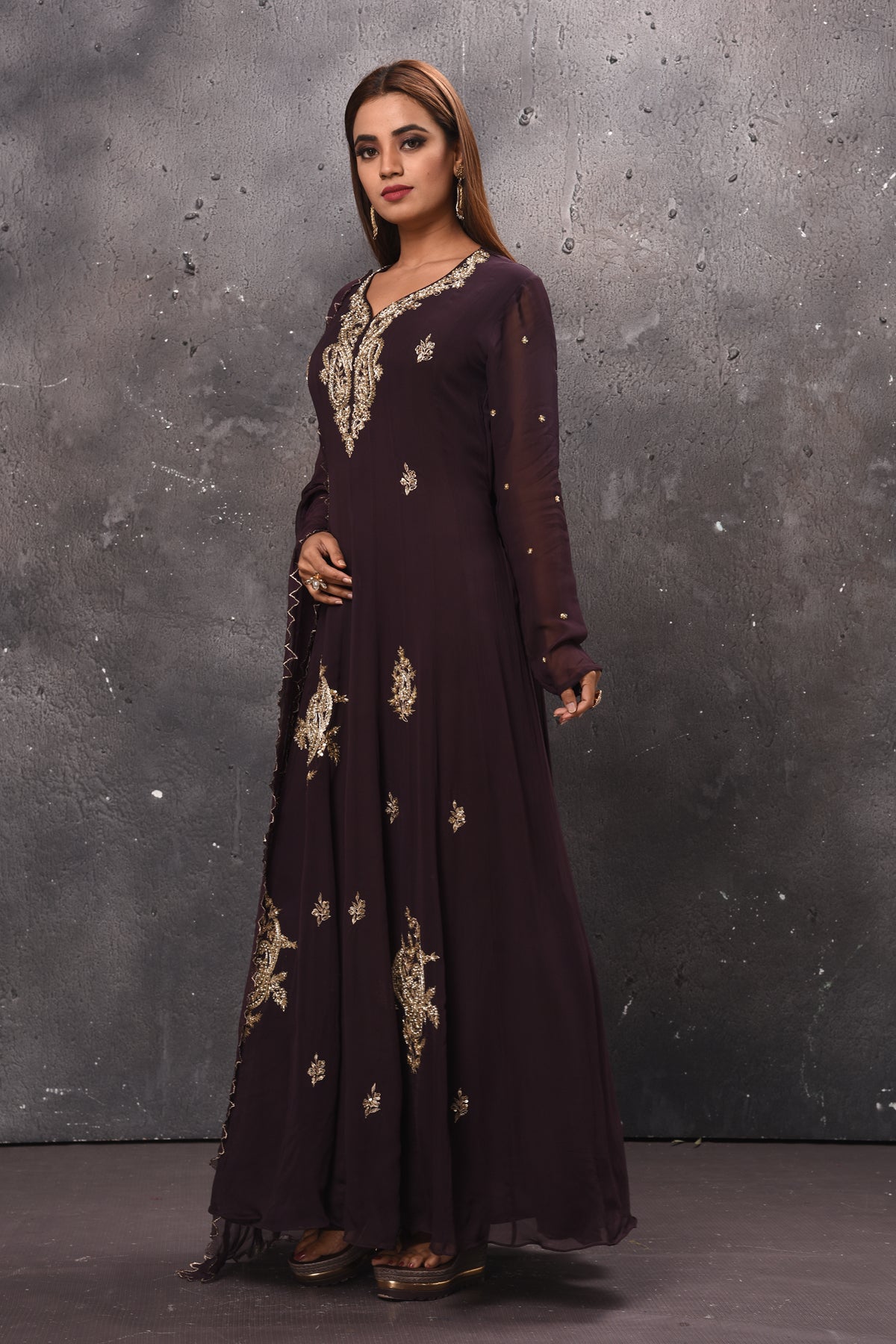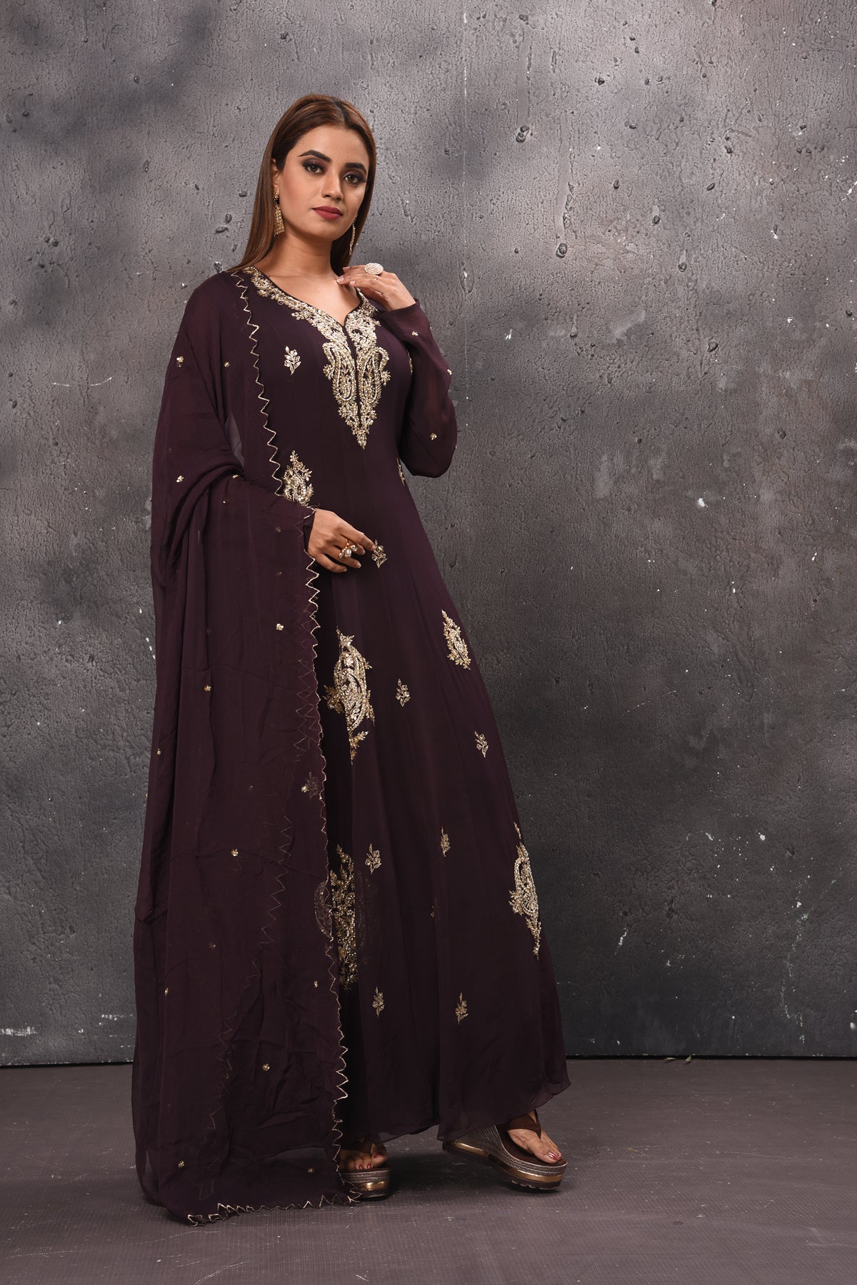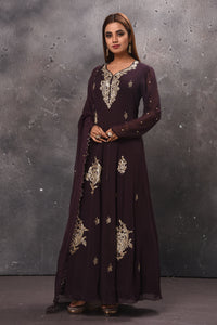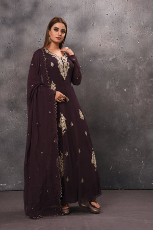 Be the center of attraction in this stunning coffee brown embroidered Anarkali suit with dupatta
