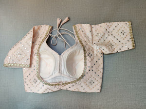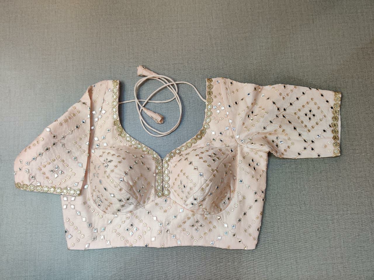 Pair your sarees with this cream mirror work saree blouse with golden lace for a rich ethnic look. Buy designer blouse in USA from Pure Elegance..
