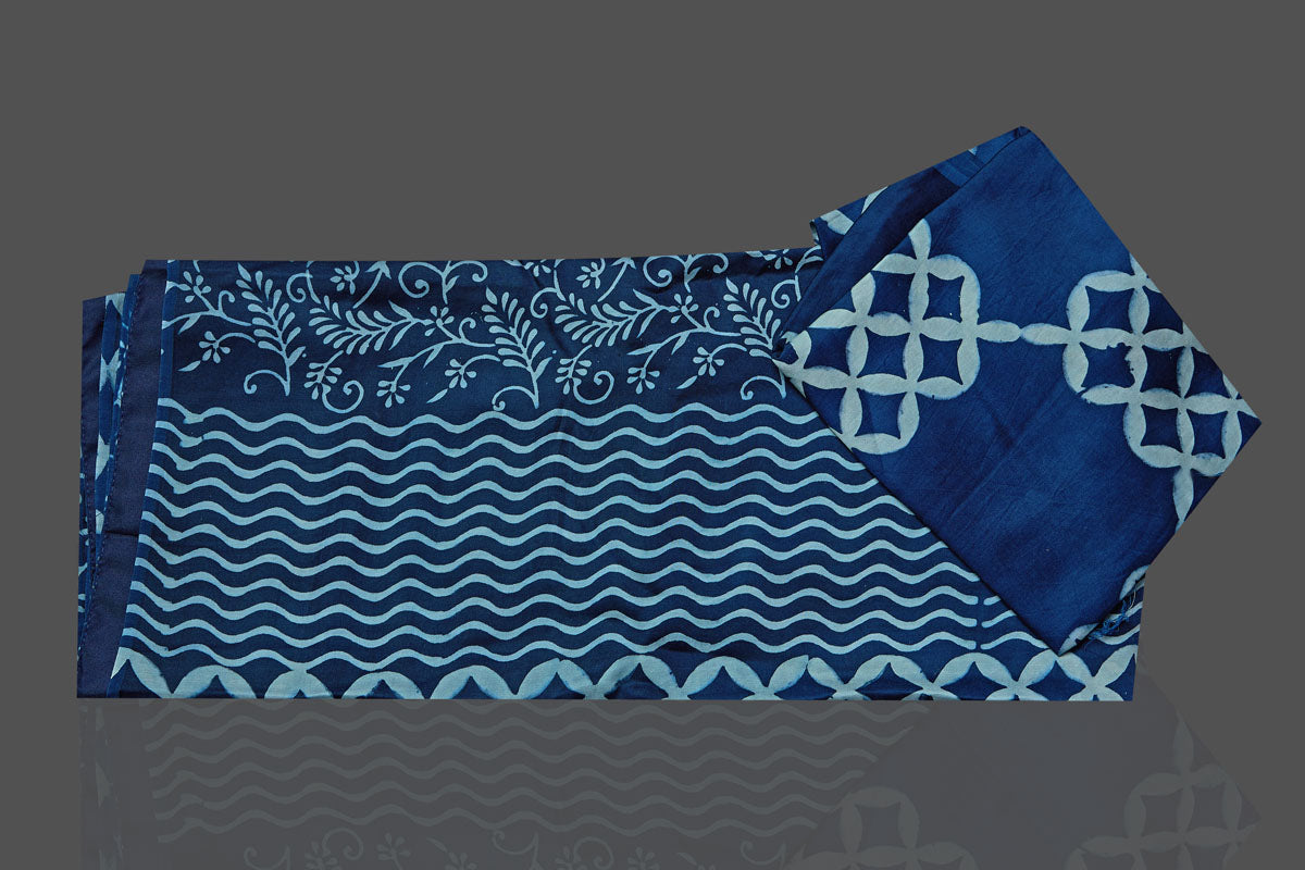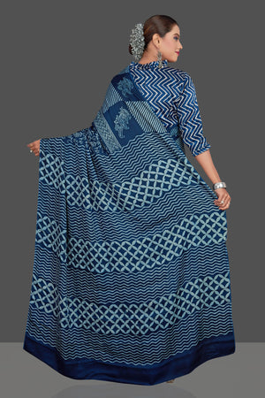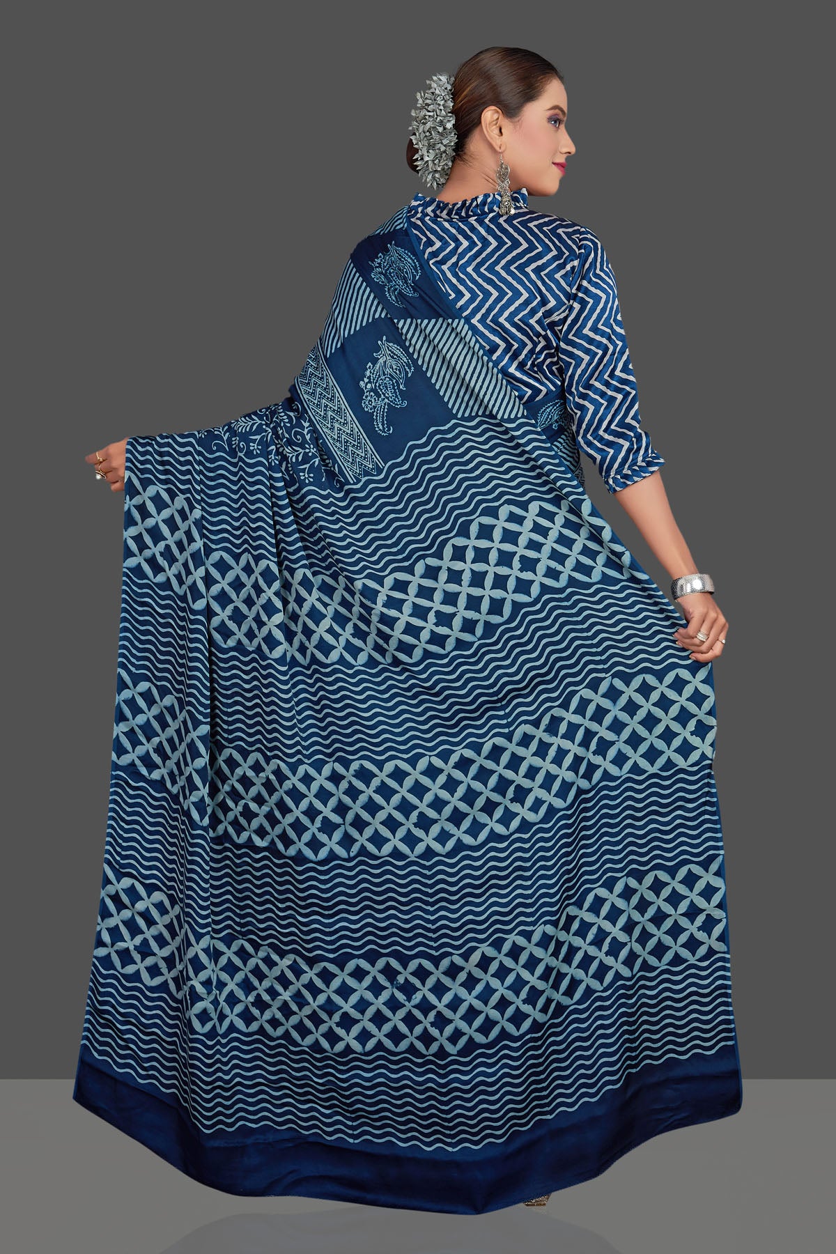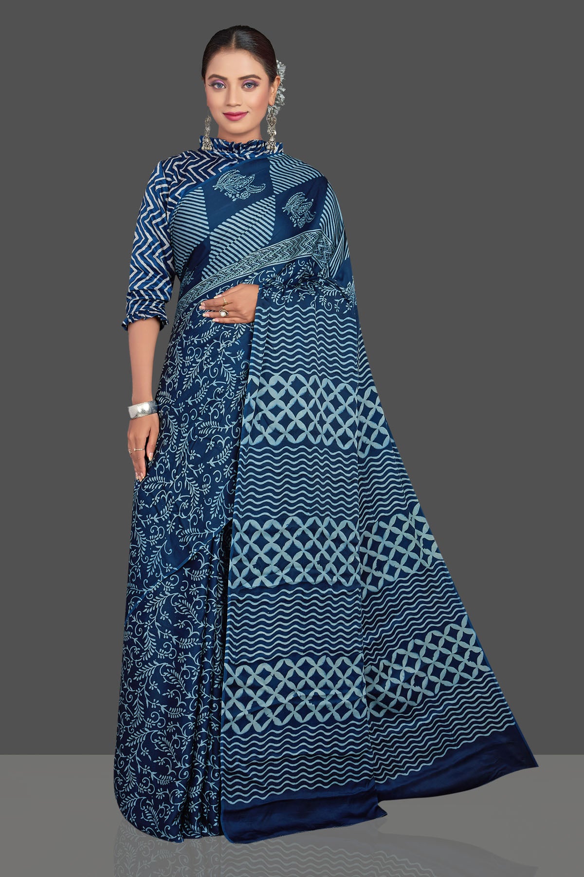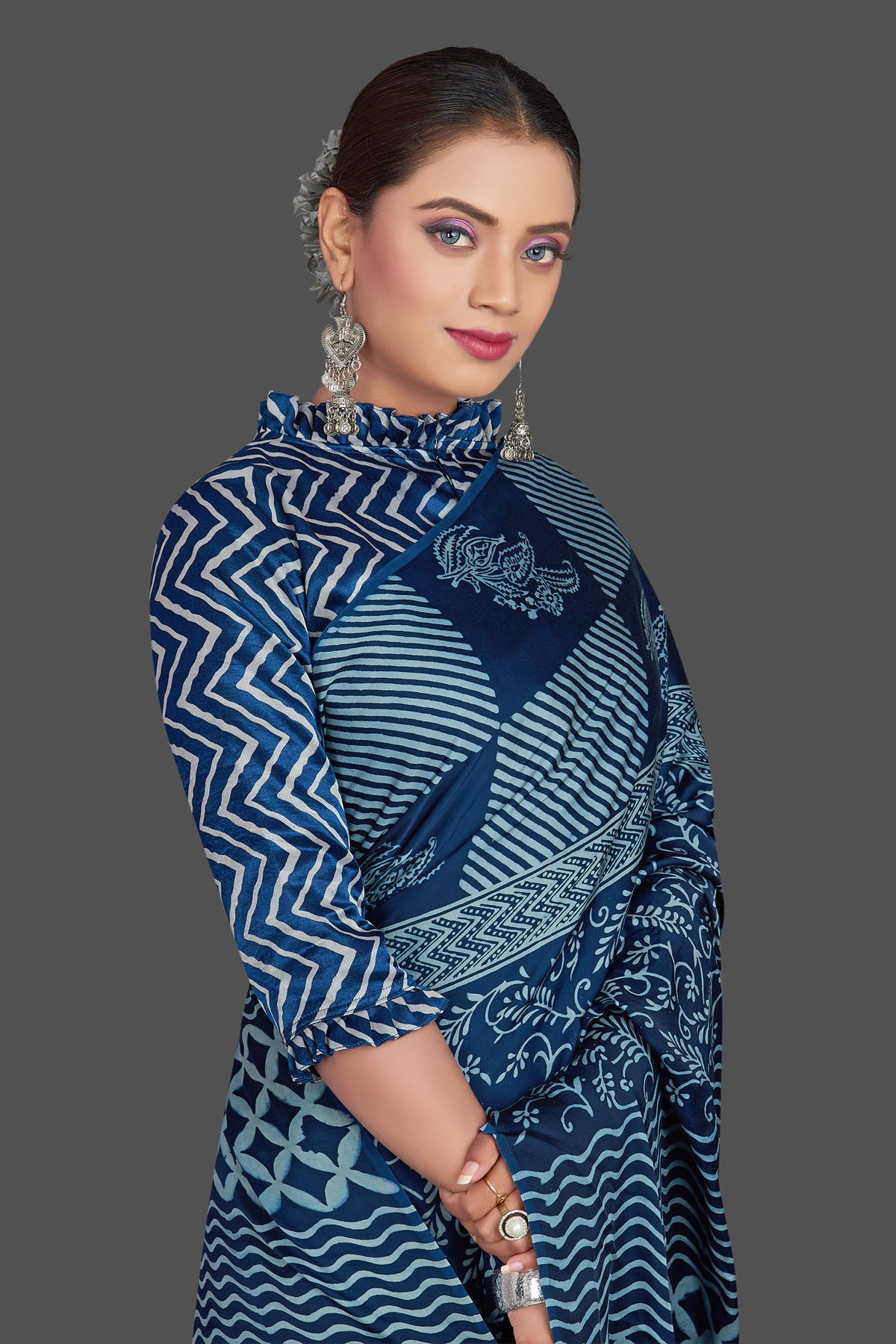 Attractive dark blue mix print modal silk saree is an elegant drape for office wear and casual outings! It comes with a matching blouse piece. Shop silk sarees in USA from Pure Elegance.