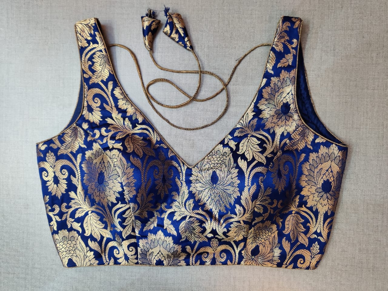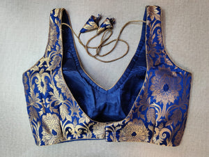 Beautiful dark blue padded Banarasi sleeveless saree blouse. Buy designer blouse in USA from Pure Elegance.