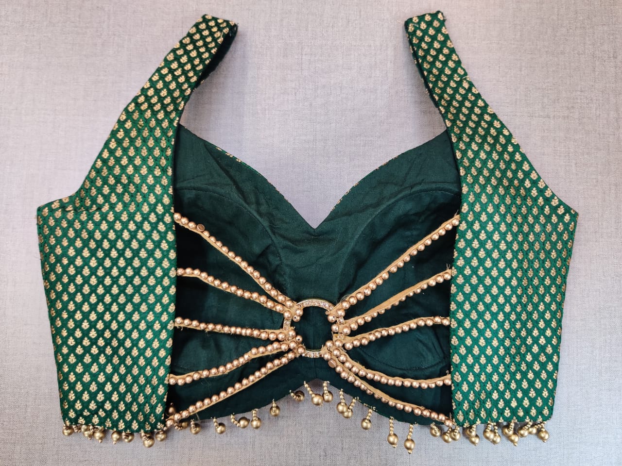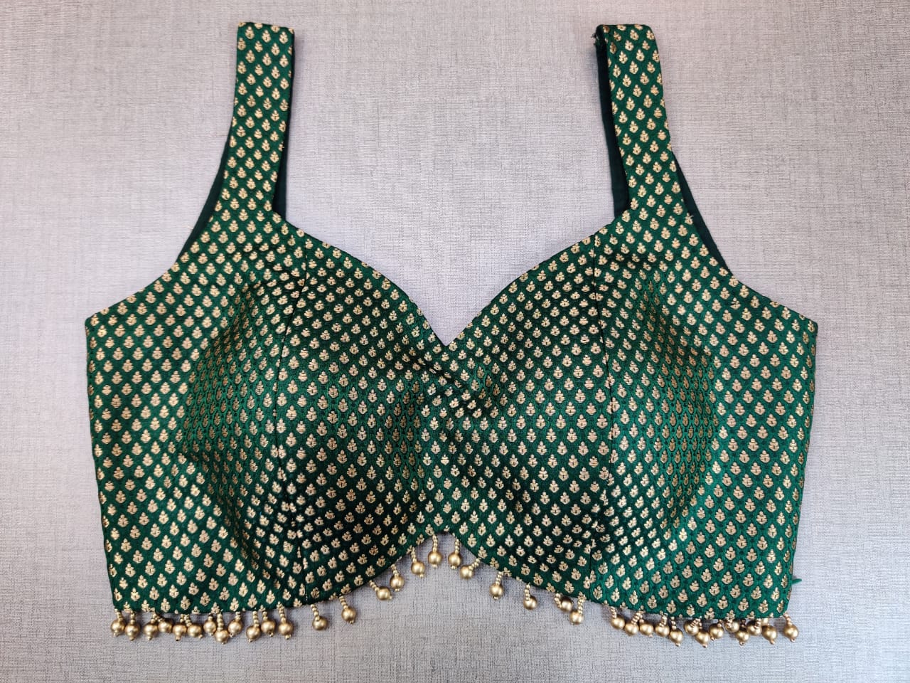Beautiful sage green Banarasi sleeveless sari blouse with golden bead tassels. Buy designer blouse in USA from Pure Elegance.