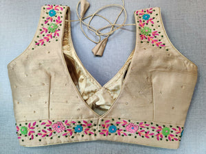 Beautiful golden embroidered sleeveless saree blouse. Buy designer blouse in USA from Pure Elegance.