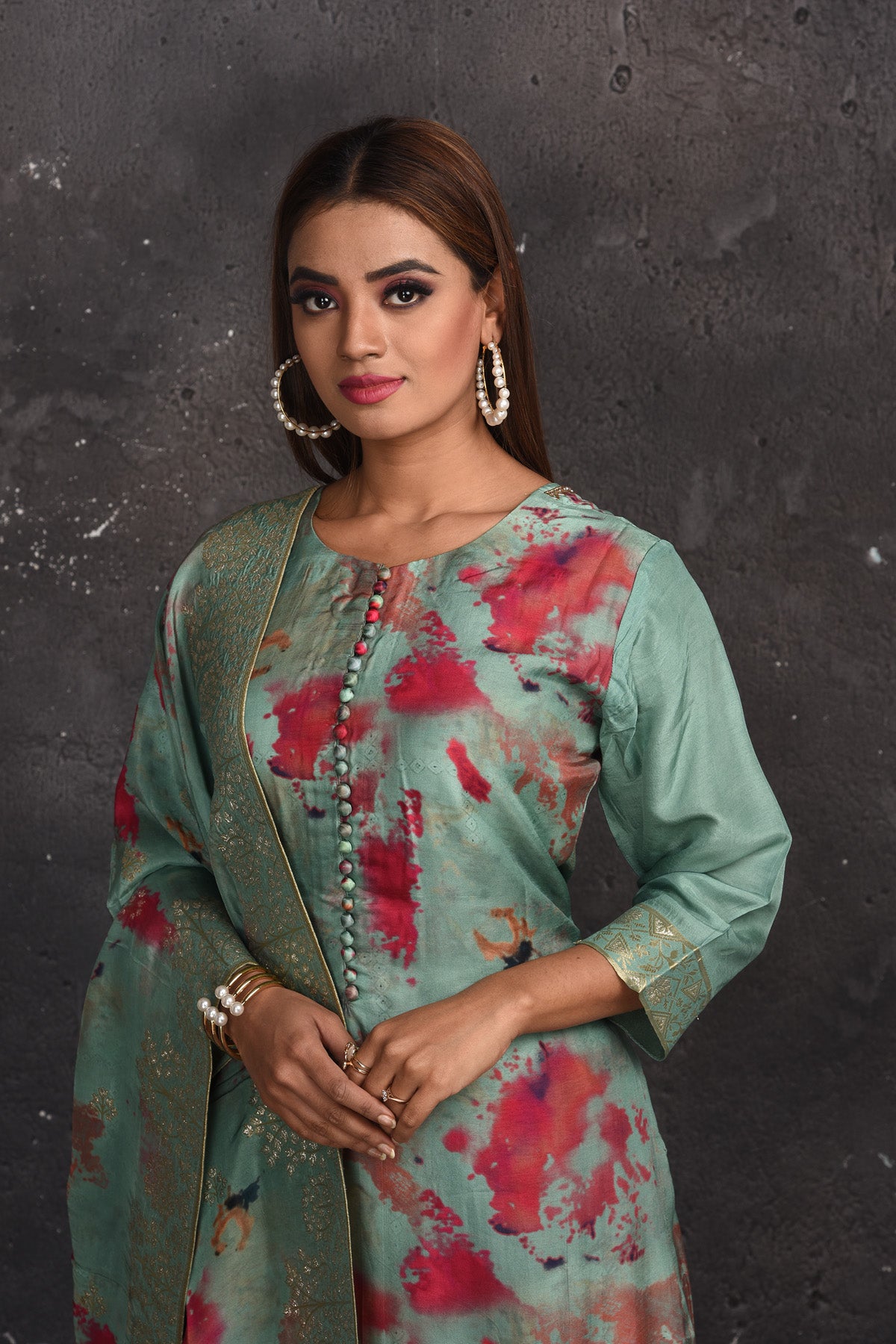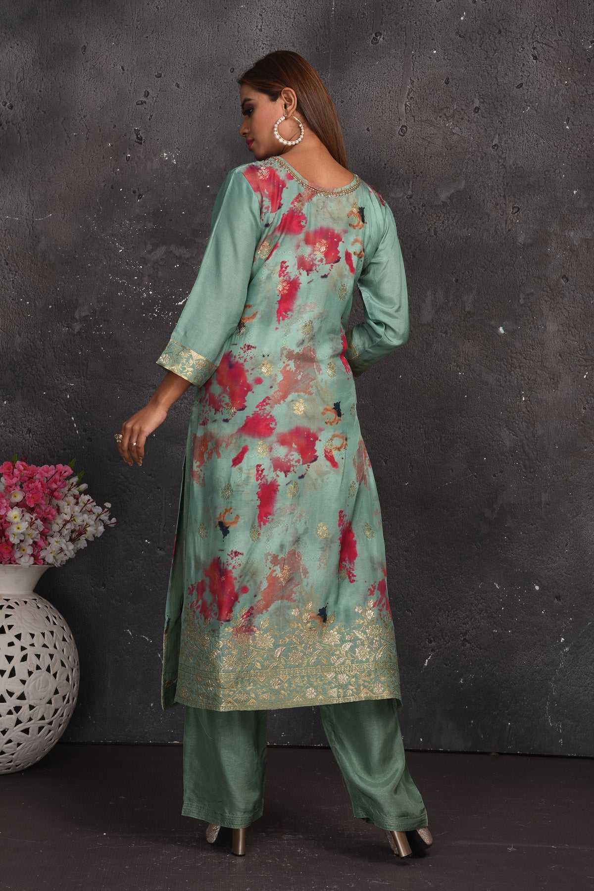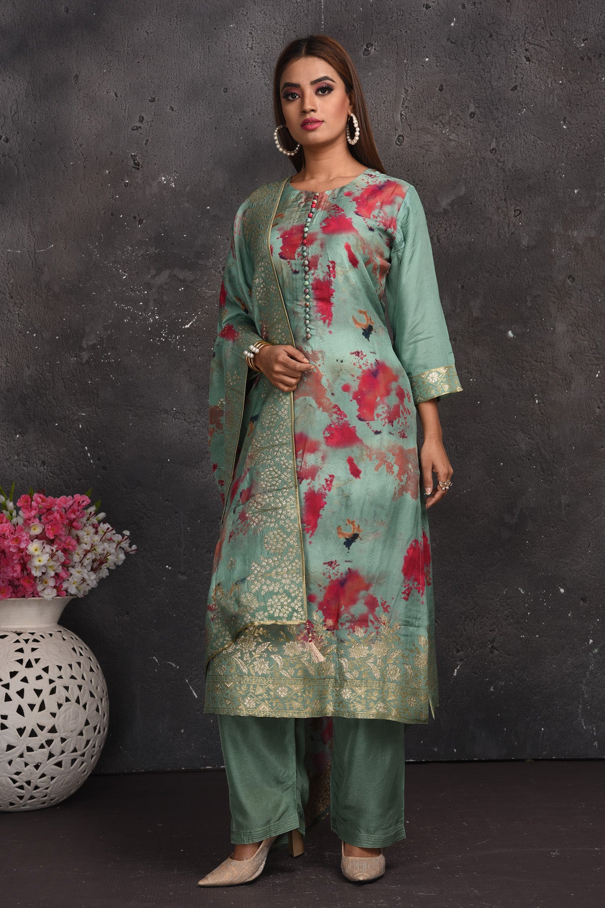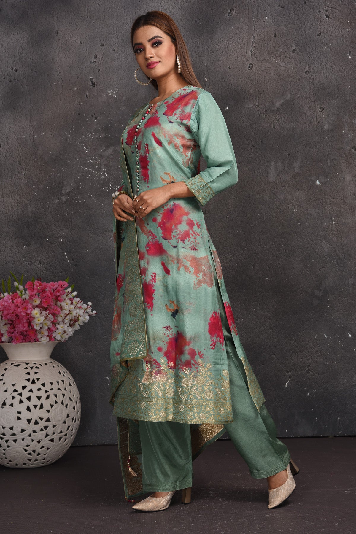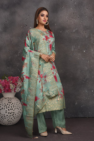 Look your best on festive occasions in this beautiful green floral print palazzo suit with dupatta