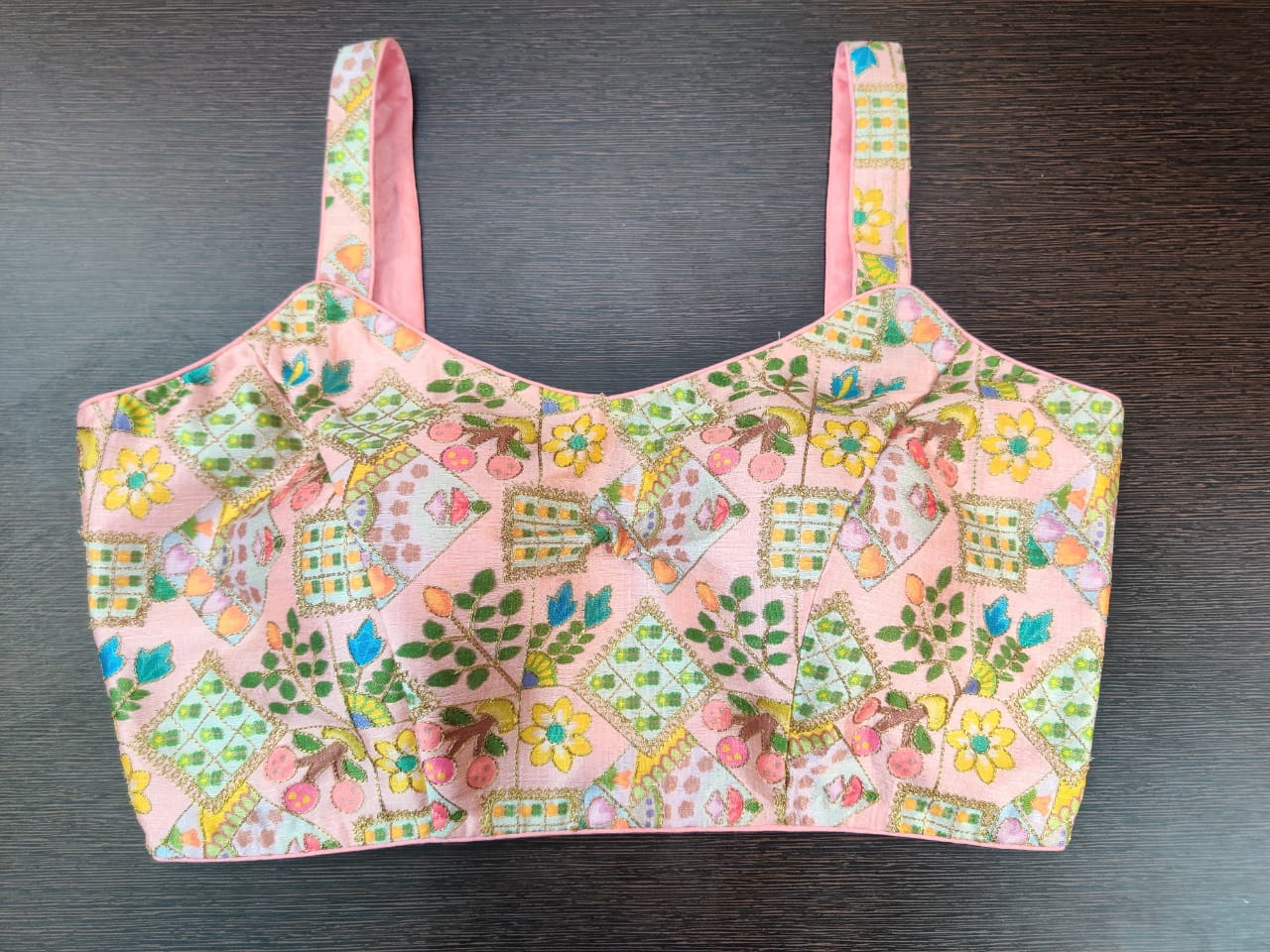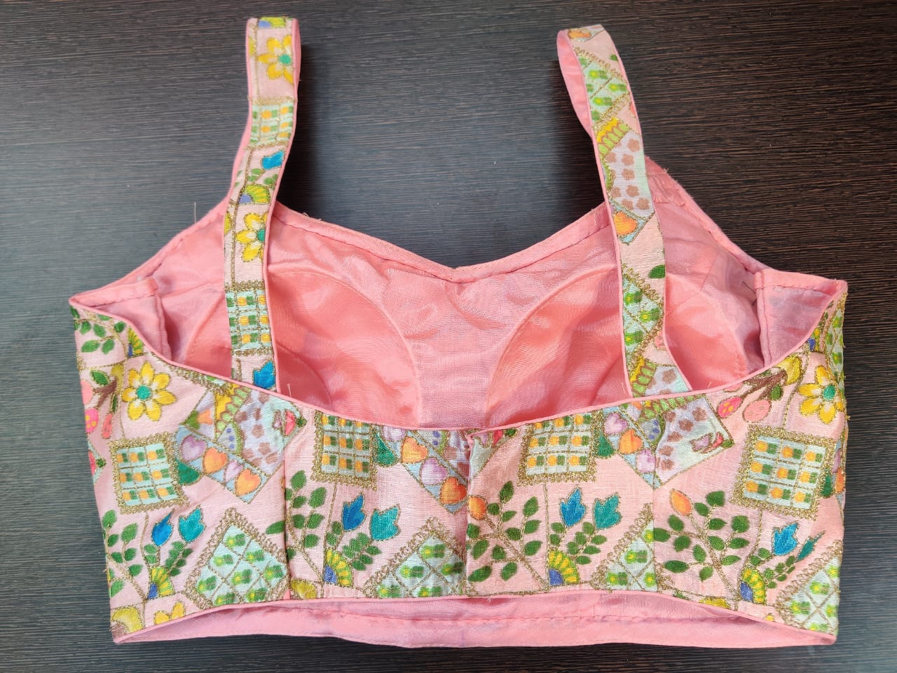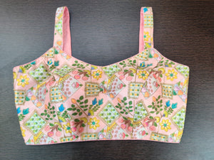 Stunning light pink printed strappy sari blouse . Buy designer blouse in USA from Pure Elegance.
