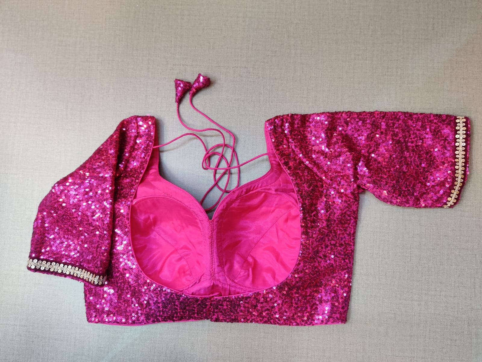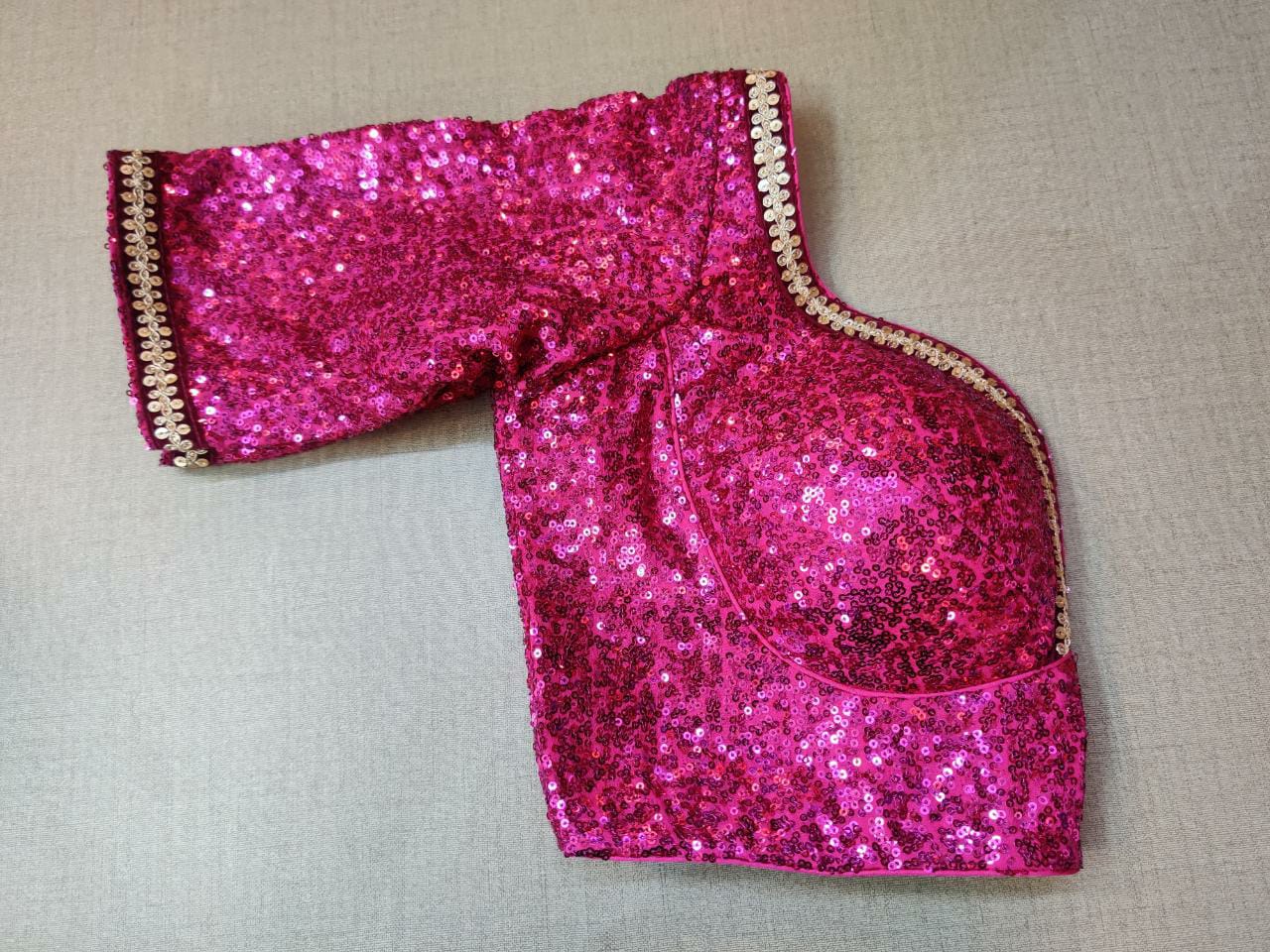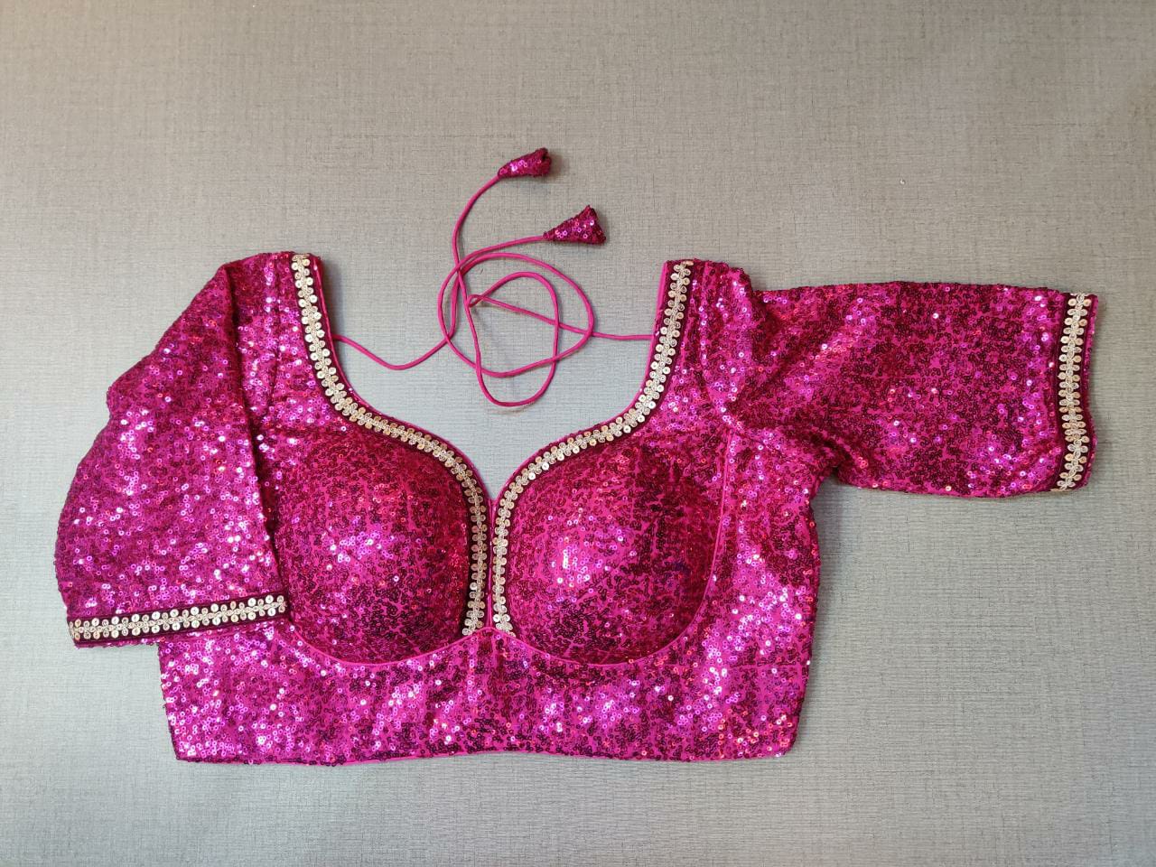 Add a royal touch to your saree look with this beautiful magenta sequin work saree blouse with frill sleeves. Buy designer blouse in USA from Pure Elegance..