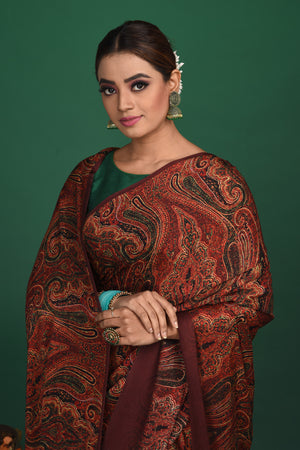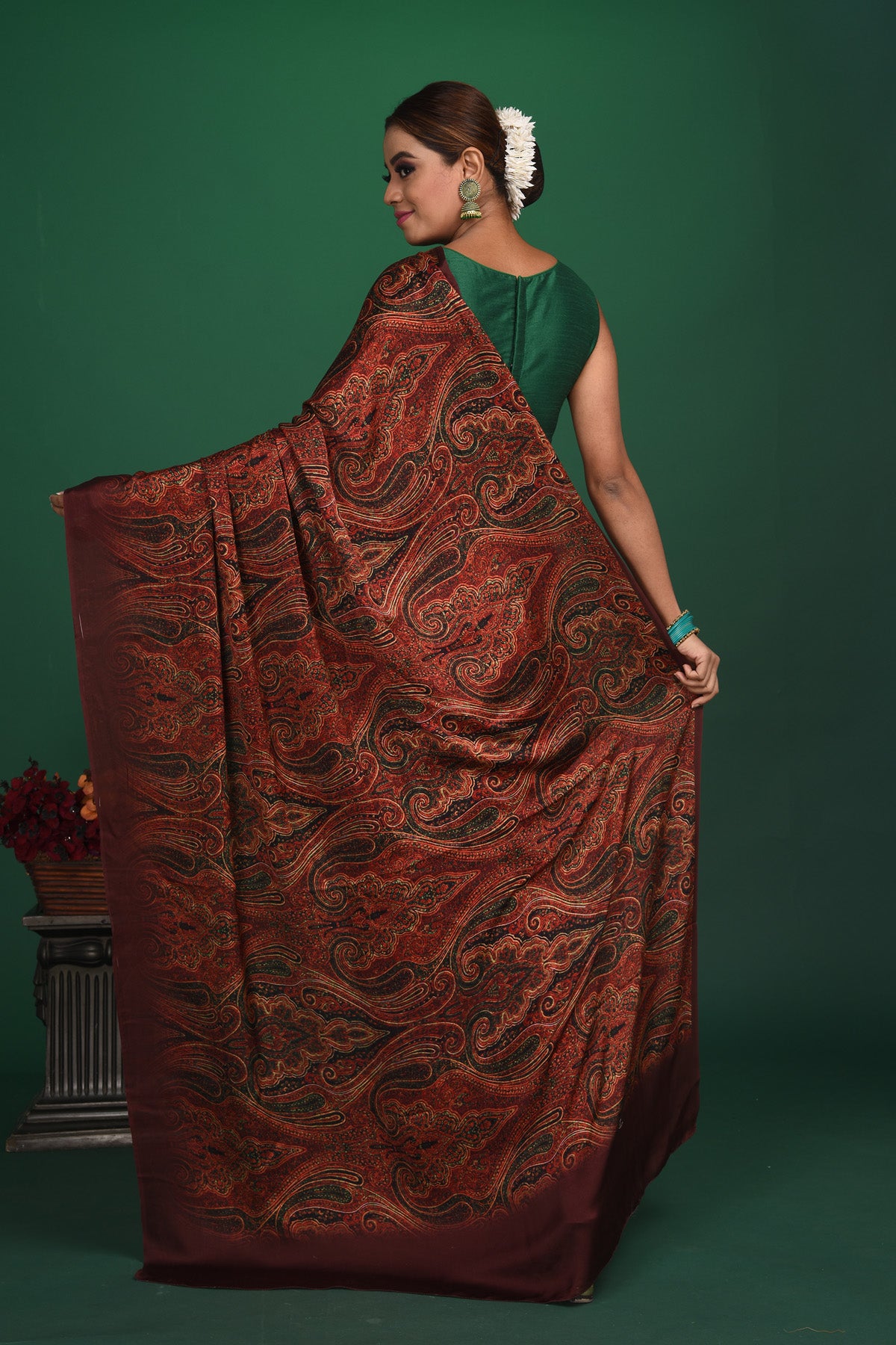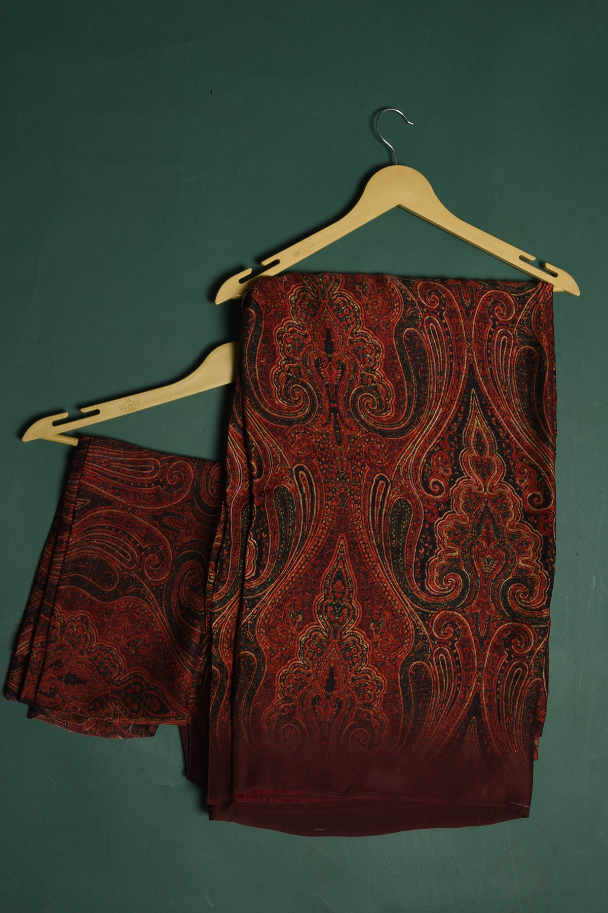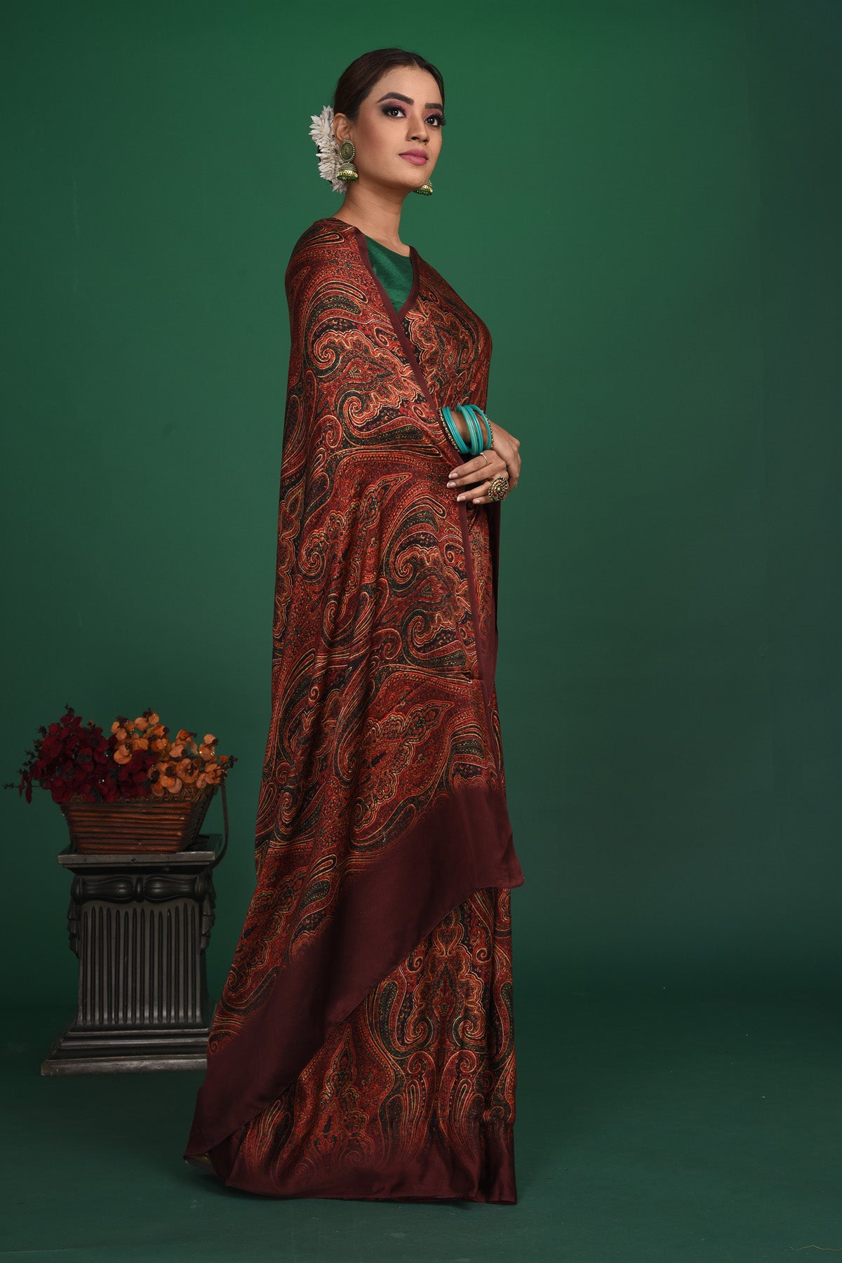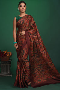 Be a vision of style and elegance at parties in this gorgeous maroon printed crepe satin saree. It comes with a matching blouse piece. Shop designer sarees online in USA from Pure Elegance.