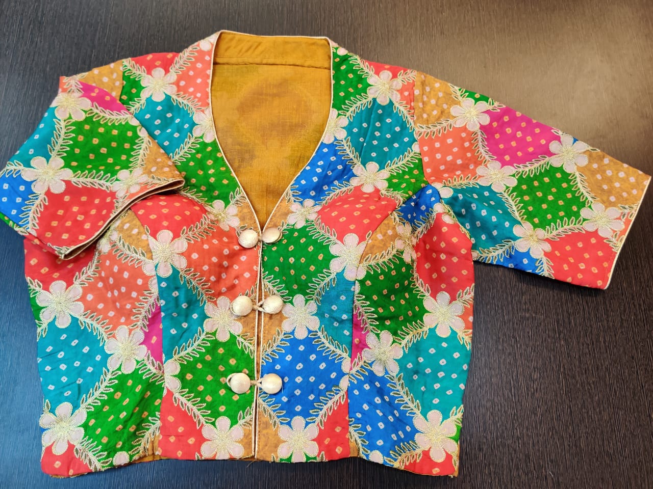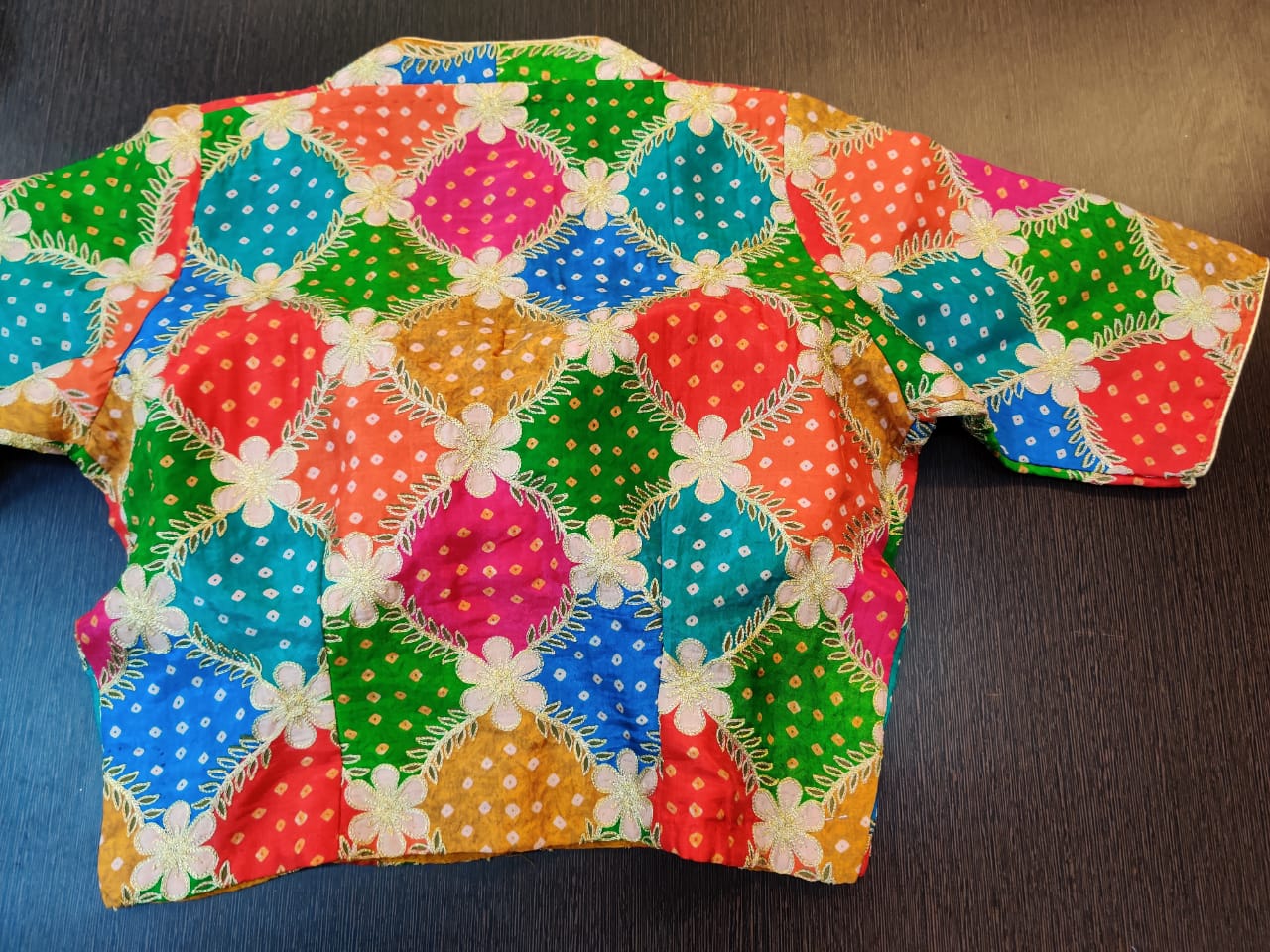 Gorgeous multicolor embroidered Bandhani sari blouse. Shop designer saree blouse online in USA from Pure Elegance.