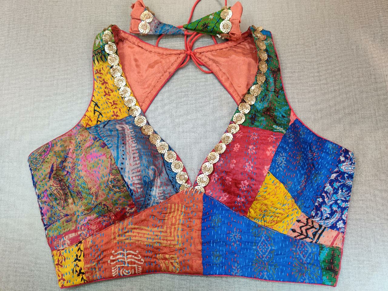 Beautiful multicolor patch Kantha stitch sleevess saree blouse with sequin embroidery neckline. Buy designer blouse in USA from Pure Elegance.