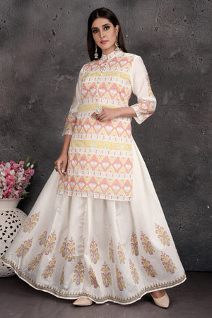 Add a bohemian vibe to your style with this elegant off-white printed skirt with kurti. Shop Indian dresses in USA from Pure Elegance.