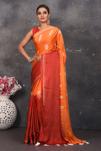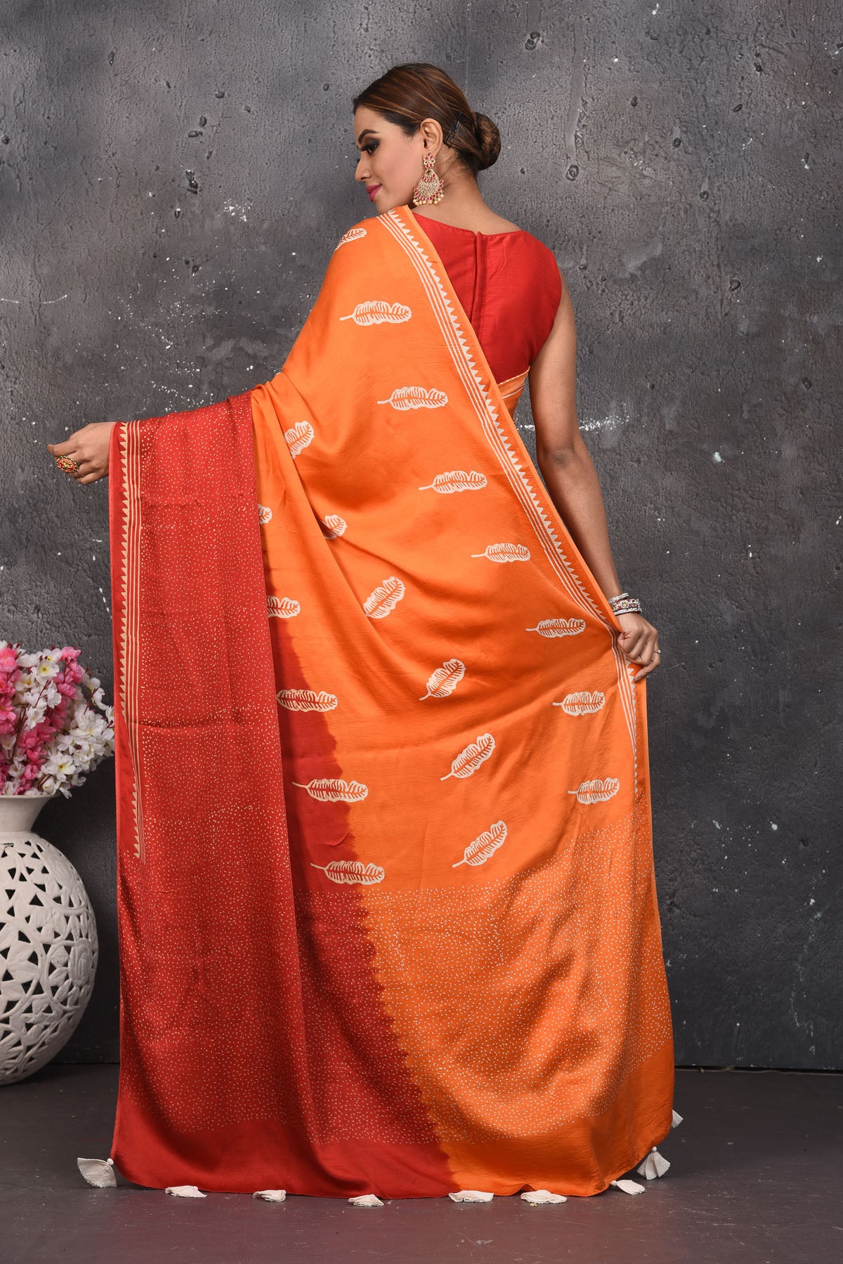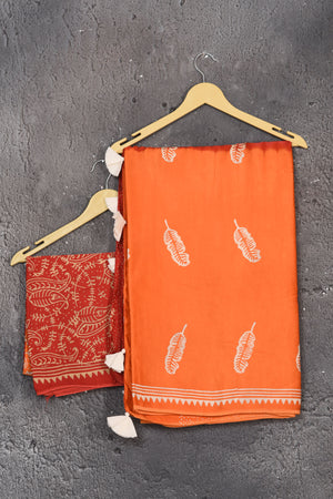 Alluring orange and red printed modal silk sari is sure to grab attention at parties and festive occasion. It comes with a matching blouse piece.