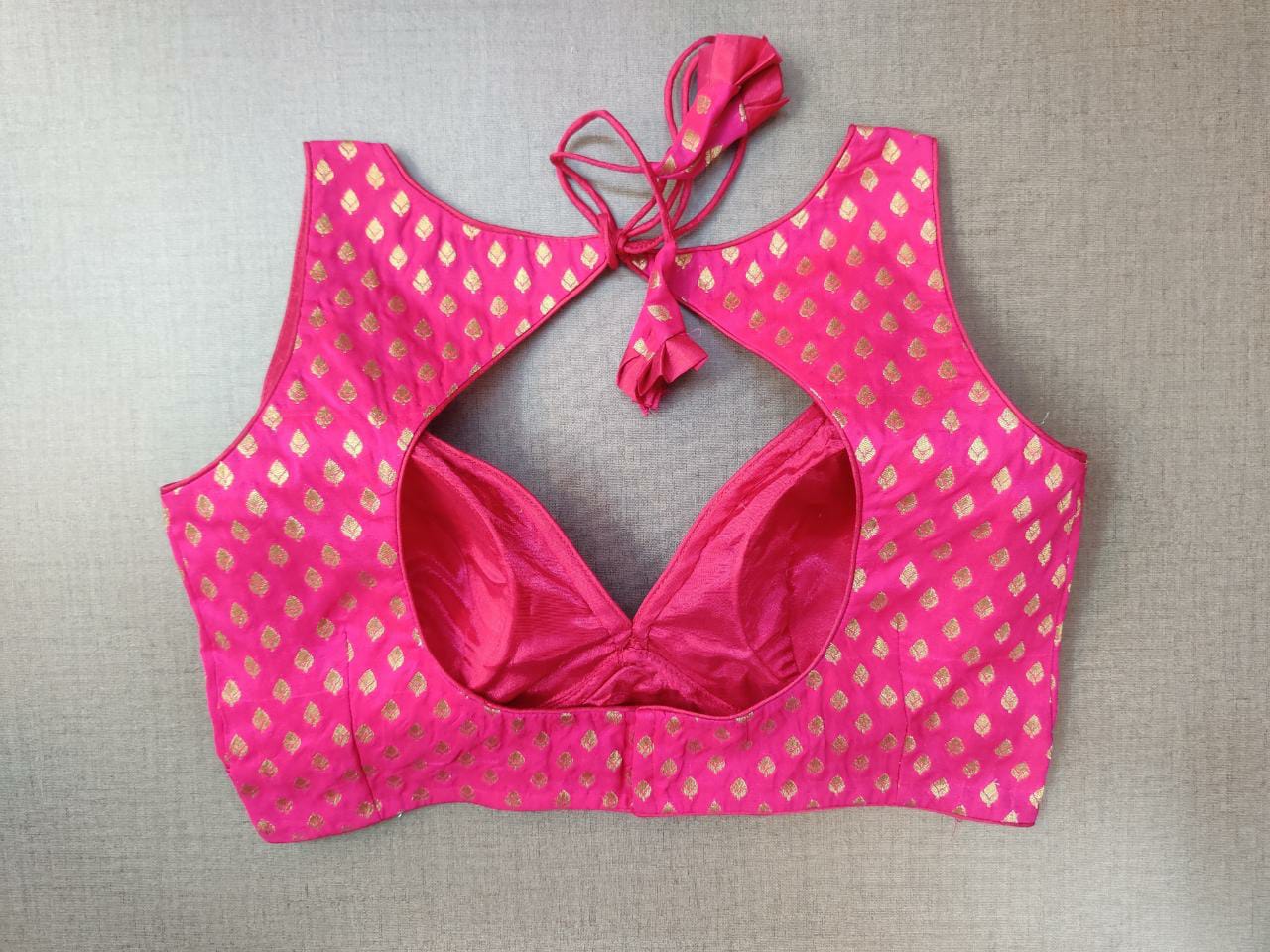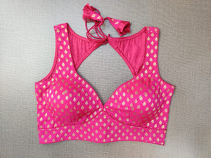 Beautiful pink Banarasi sleeveless saree blouse. Buy designer blouse in USA from Pure Elegance.