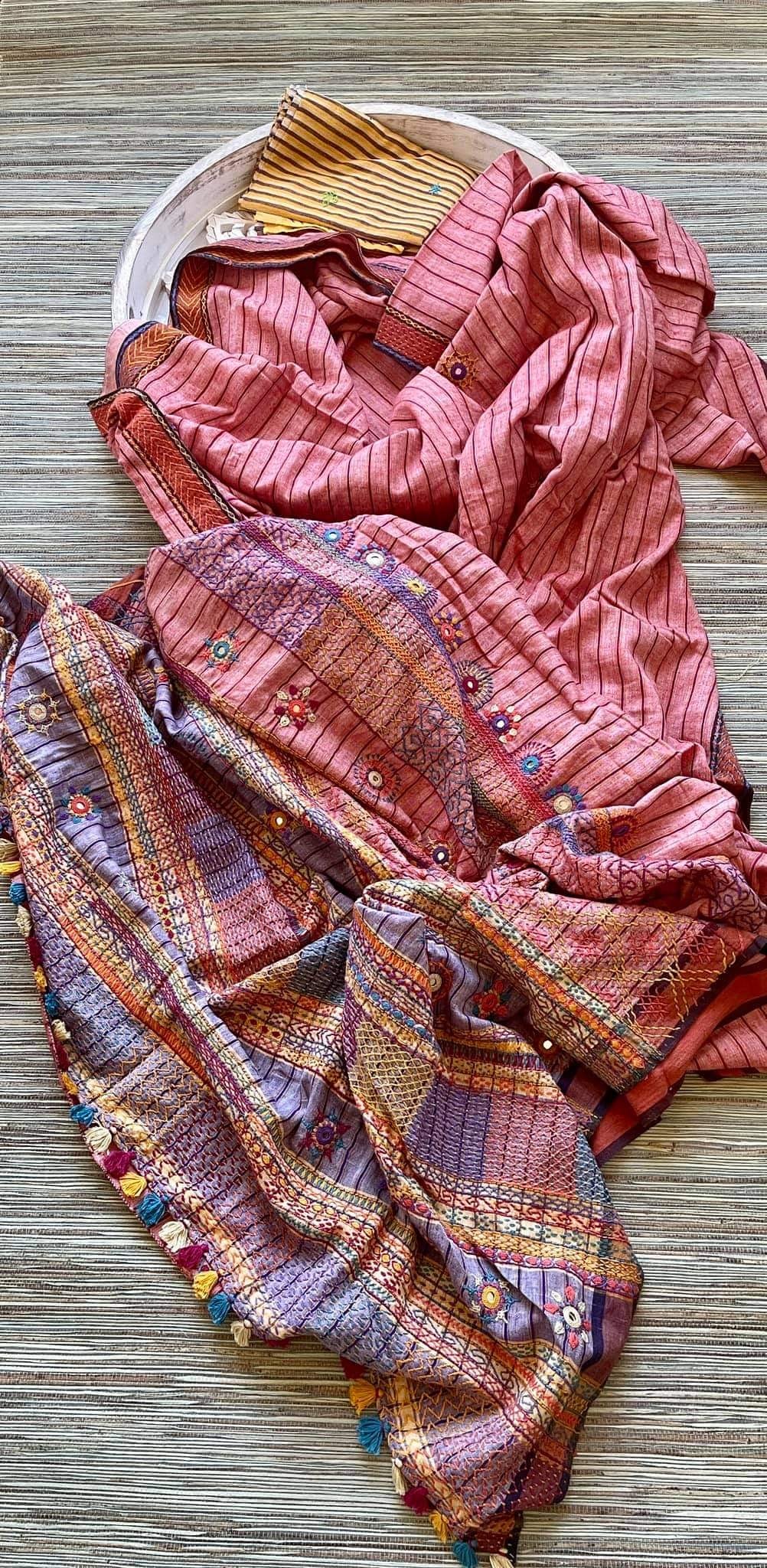 Beautiful and vibrant pink Lambani khaddi saree is one of a kind piece for your saree wardrobe. It comes with a matching blouse piece. Shop handloom sarees in USA from Pure Elegance.