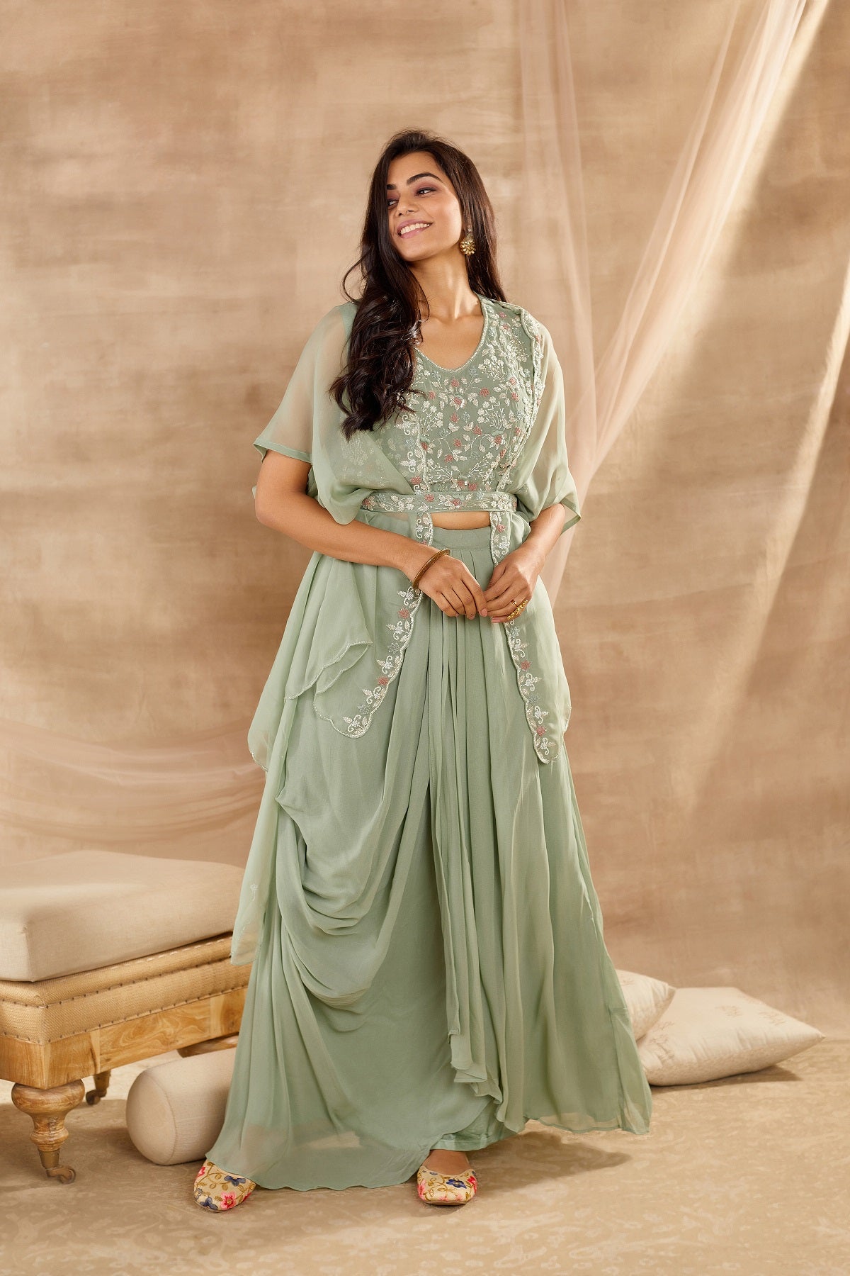 Beautiful pista green contemporary chinon co-ord set. It is perfect for parties and special occasions. Shop online from Pure Elegance.