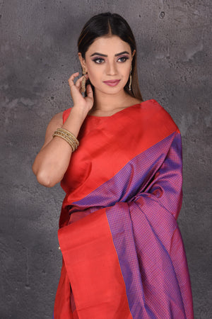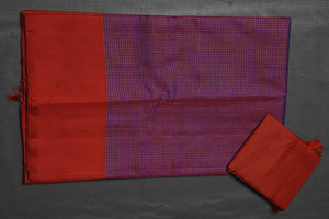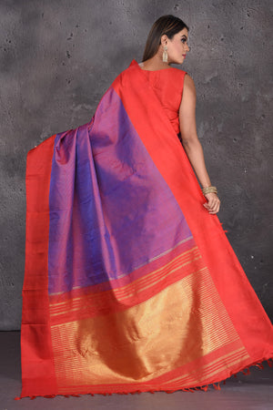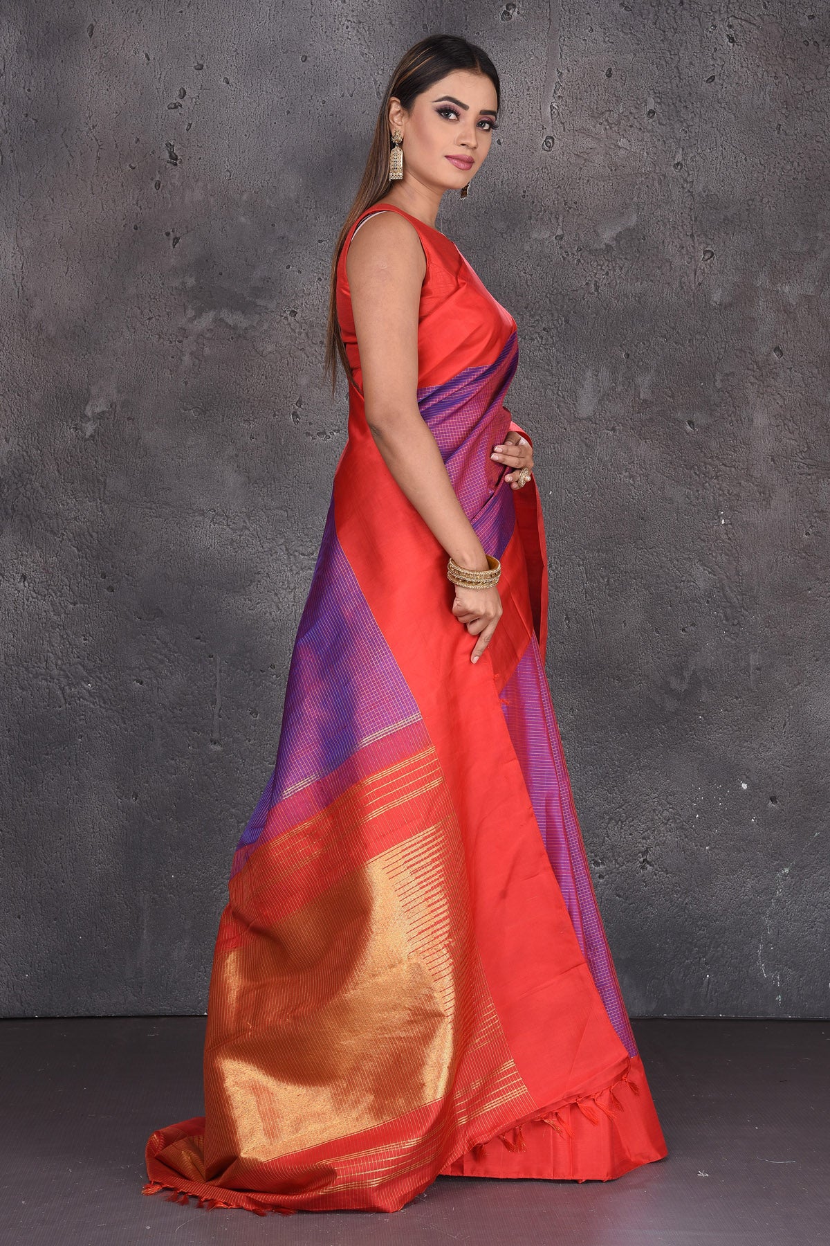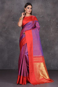 Beautiful purple Kanjeevaram silk saree with red border and red zari pallu. It comes with a matching blouse piece. Shop Kanchipuram silk sarees in USA from Pure Elegance.