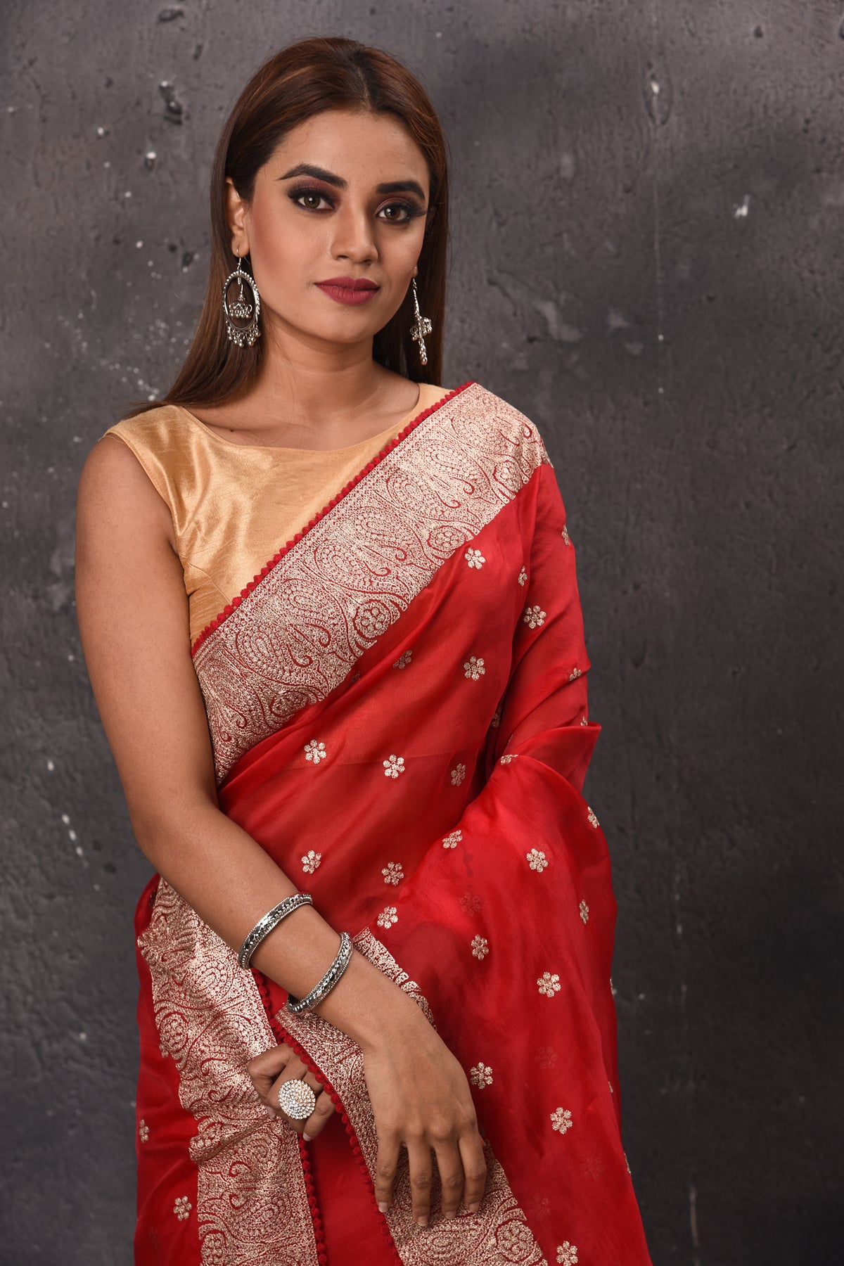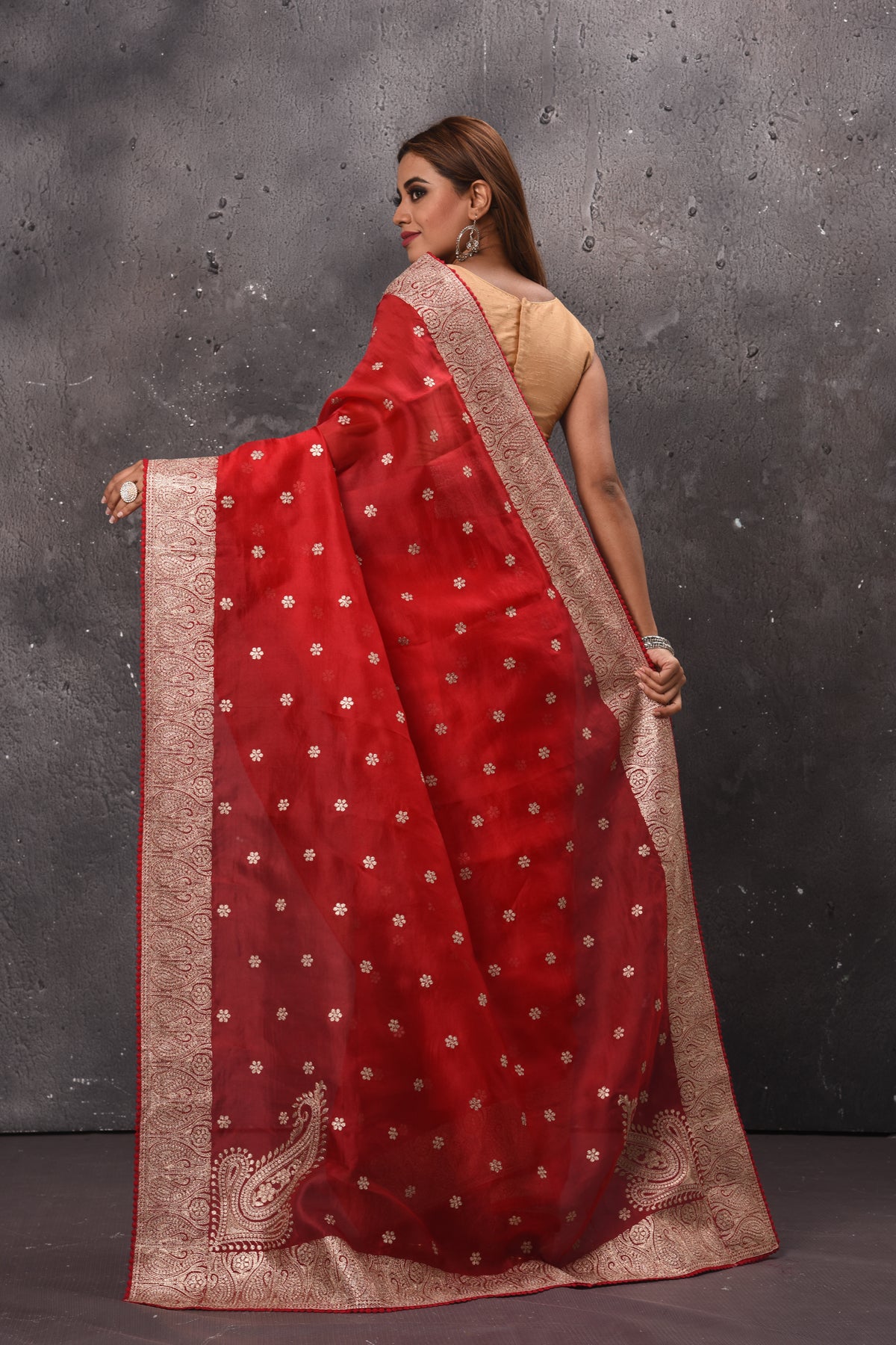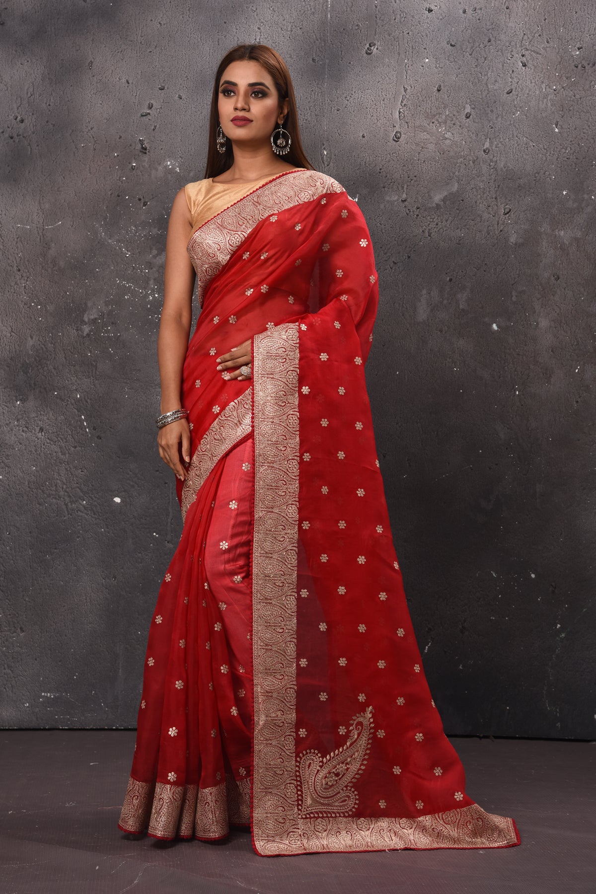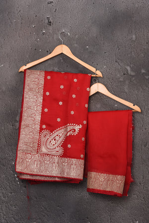 Get set to dazzle in this beautiful red embroidered organza saree. The saree comes with a matching blouse piece. The saree is perfect for wedding occasions and parties.
