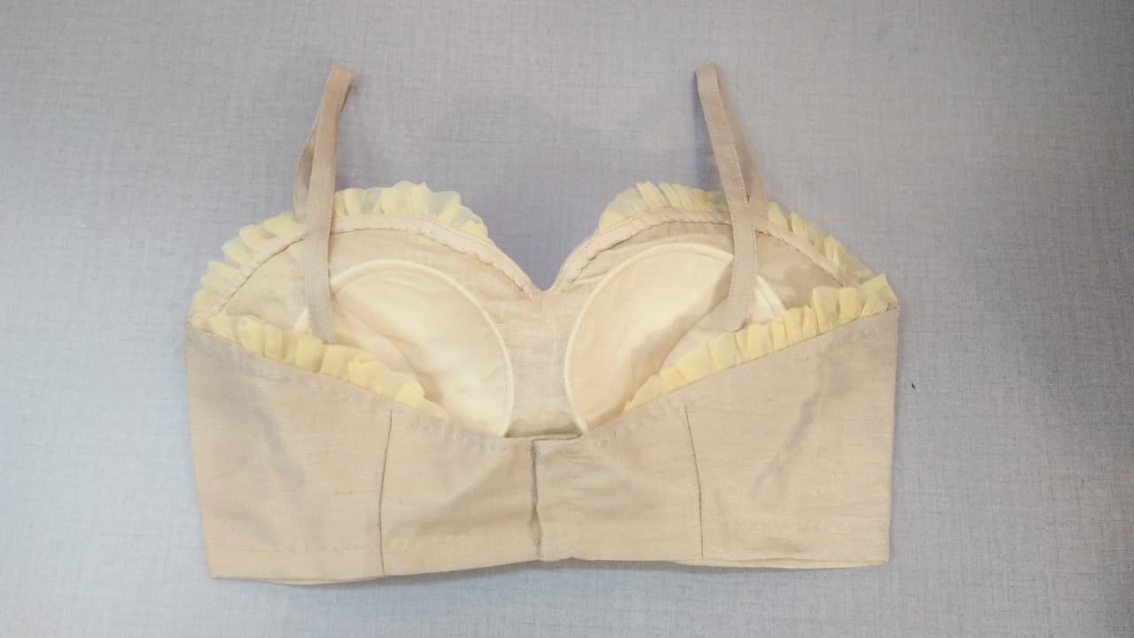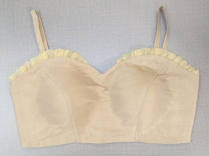 Beautiful solid cream strappy sari blouse with frill edging. Buy designer blouse in USA from Pure Elegance.