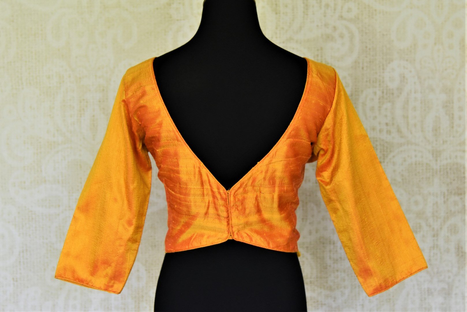 Bright yellow koti style silk saree blouse with V-back. Shop designer blouse online in USA from Pure Elegance.