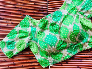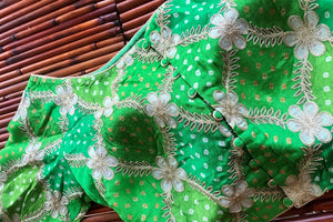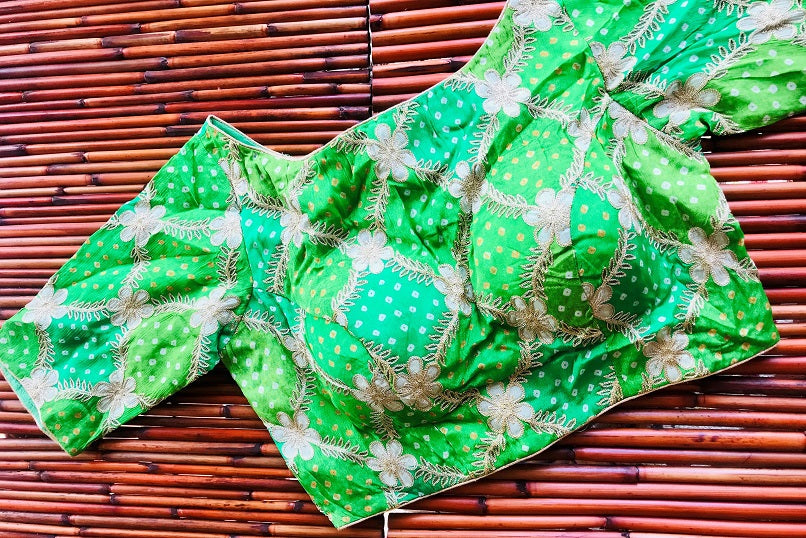 Stunning two-tone green embroidered Bandhej sari blouse. Shop designer saree blouse online in USA from Pure Elegance.