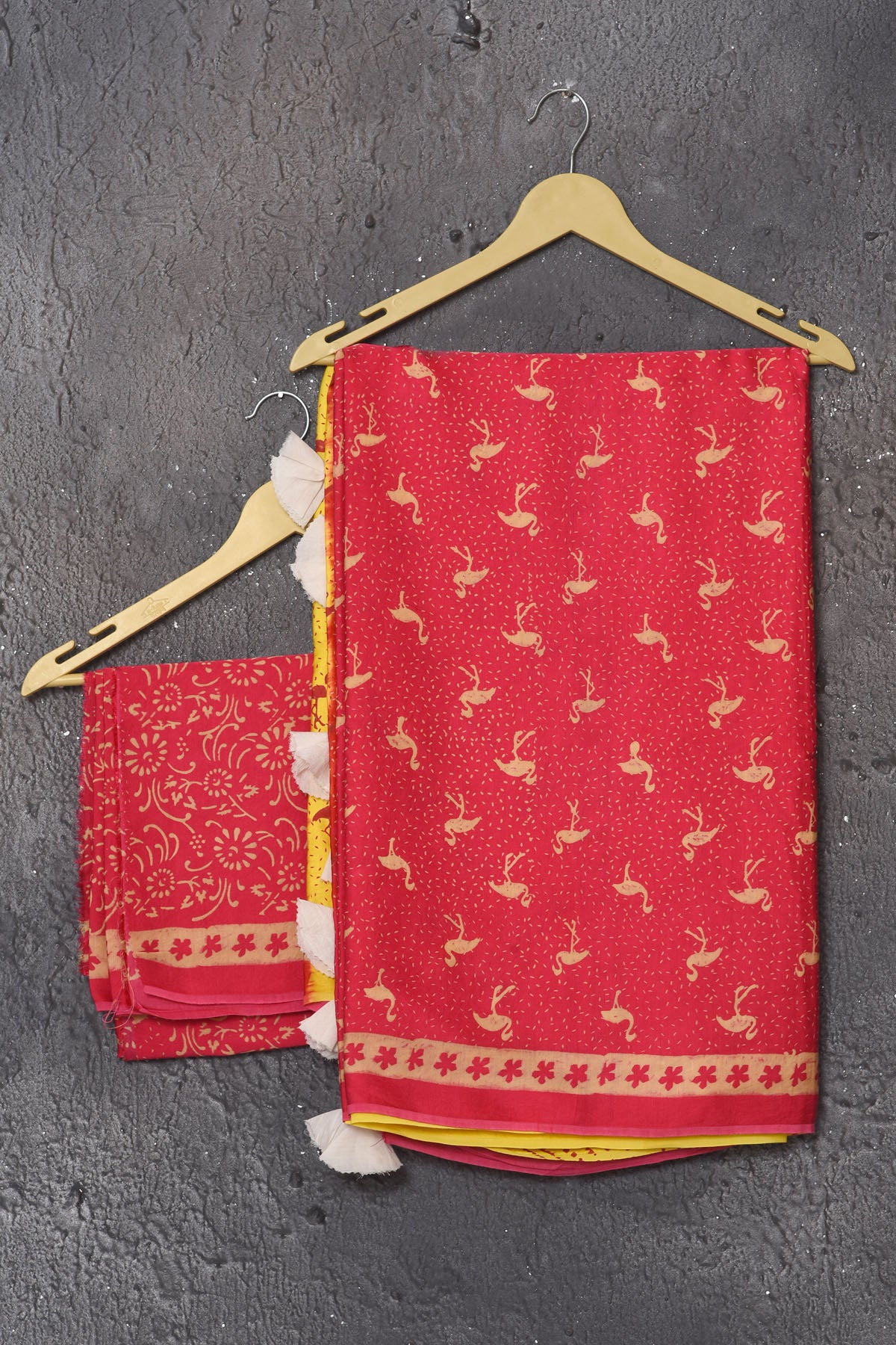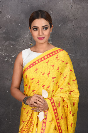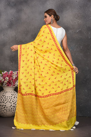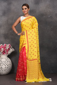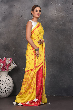 Alluring yellow and red printed modal silk saree is sure to grab attention at parties and festive occasion. It comes with a matching blouse piece.