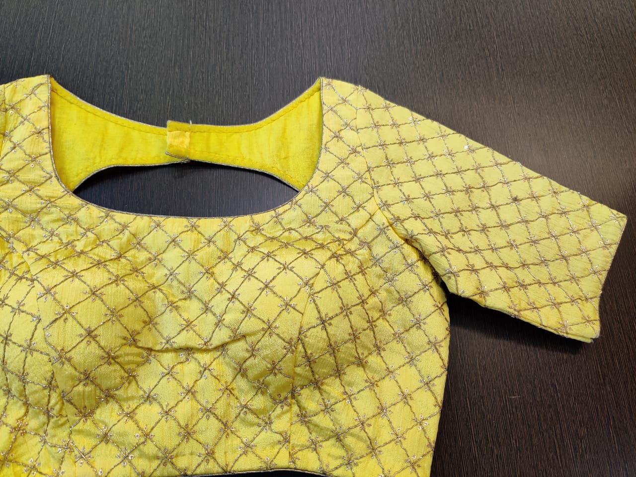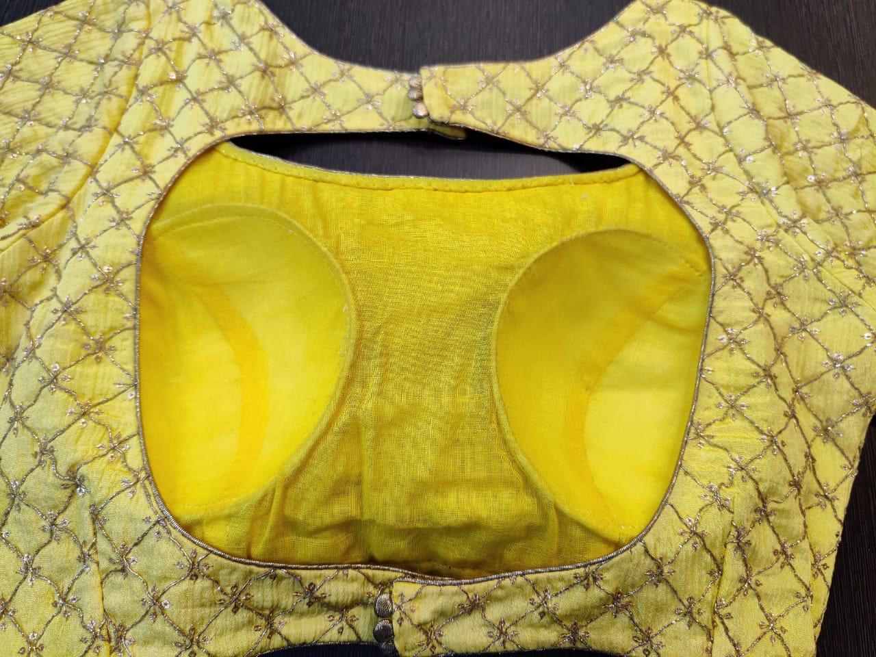 Gorgeous yellow embroidered readymade sari blouse. Buy online from Pure Elegance