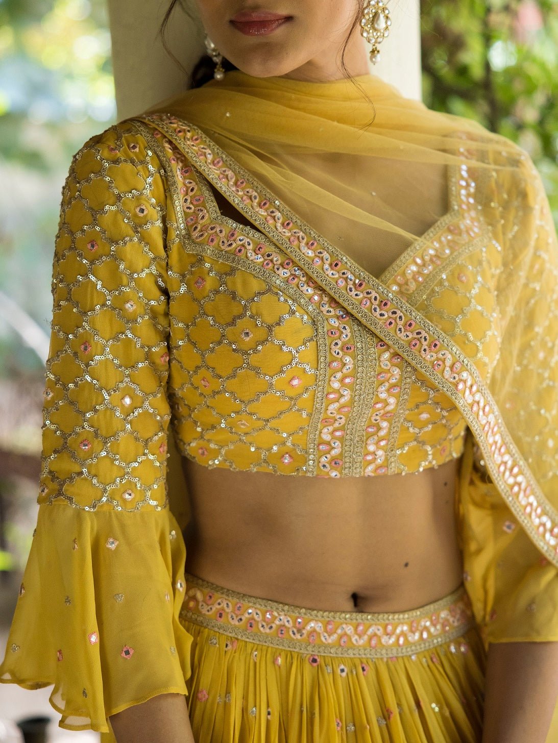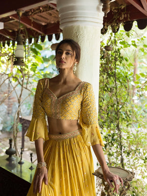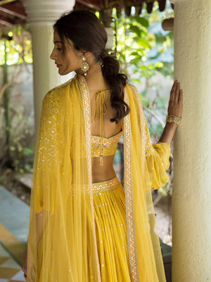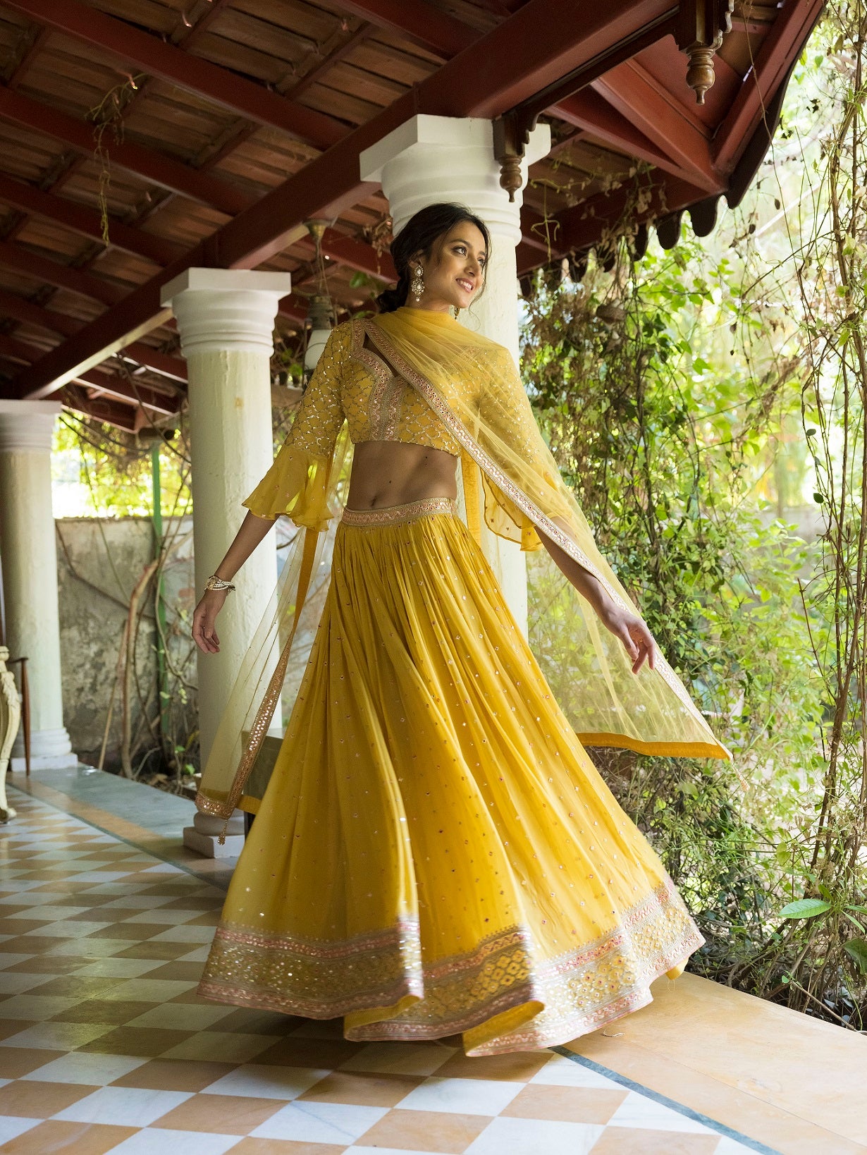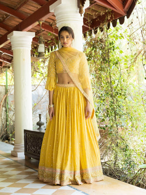 Beautiful yellow sequin work lehenga with dupatta. Shop online from Pure Elegance.