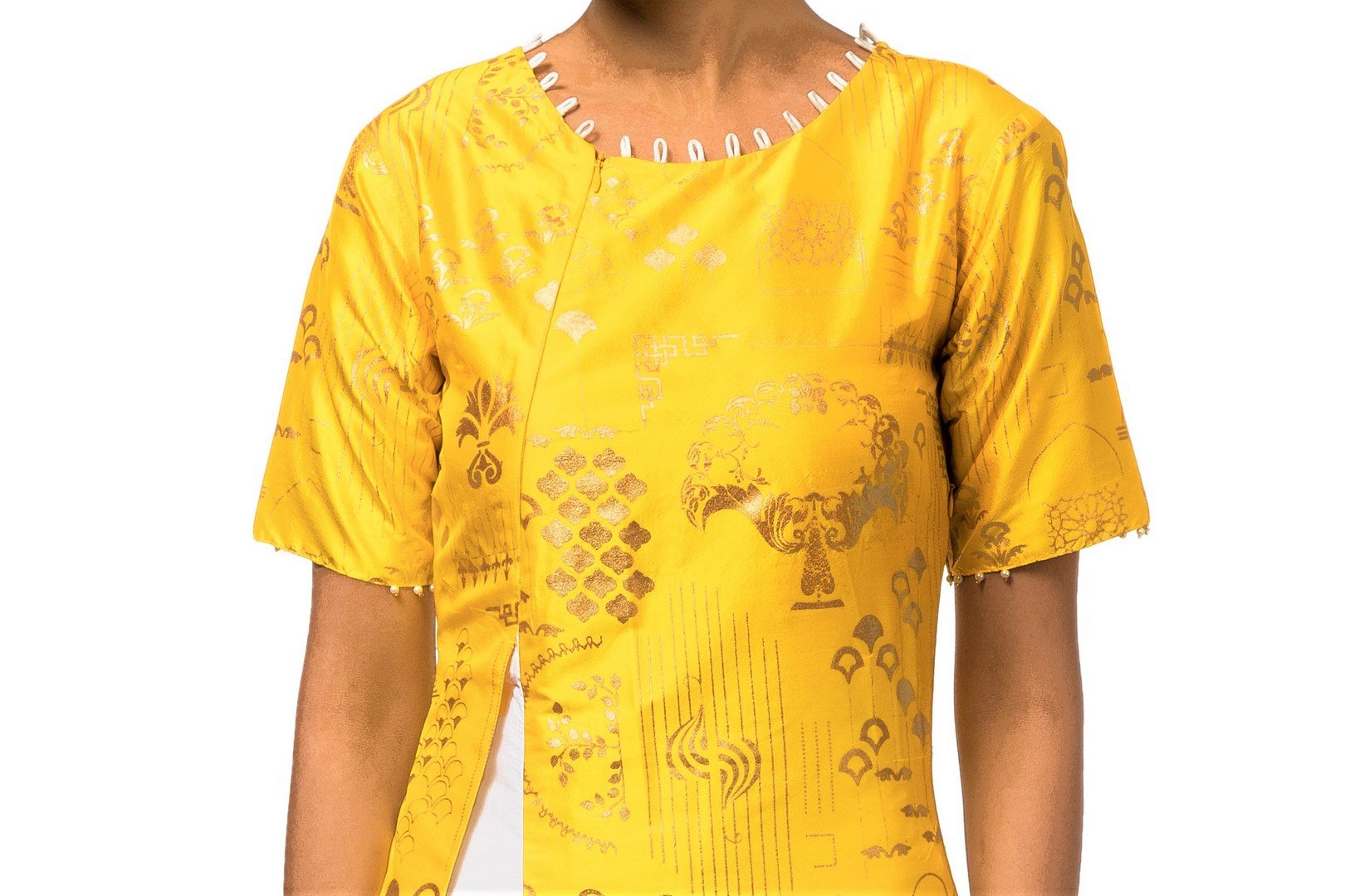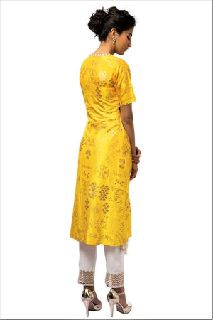 Simple and stylish yellow front slit dupion silk kurta with white pants for women who love classy fashion. Shop online at Pure Elegance or visit our store in USA.