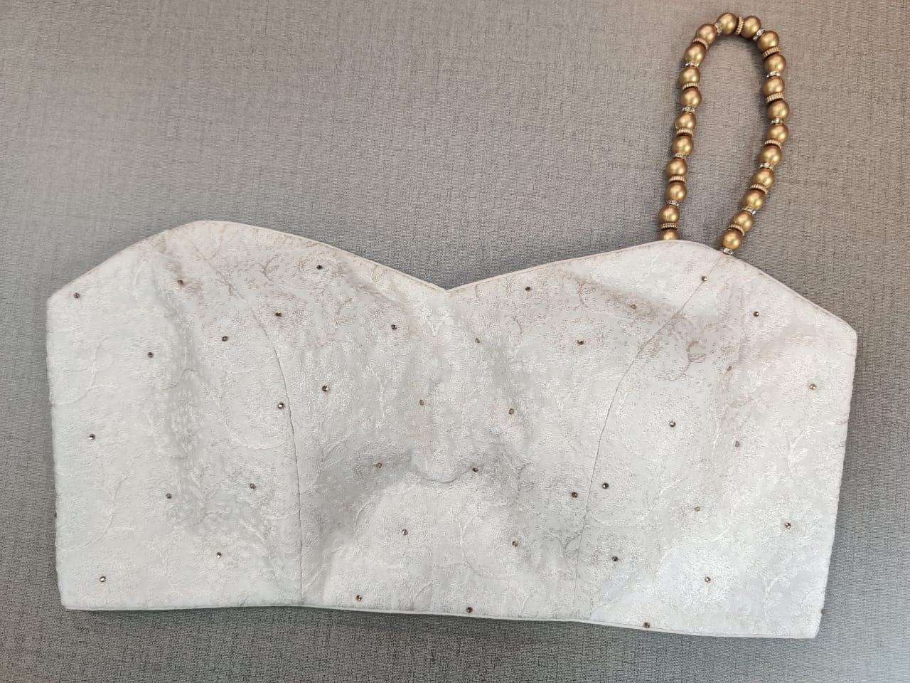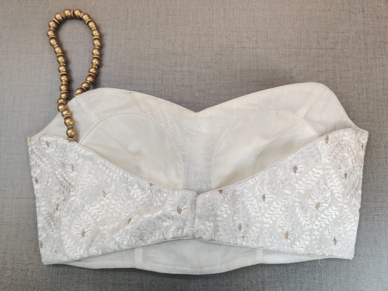 Stylish white embroidered sari blouse with one shoulder golden beads strap. Buy designer blouse in USA from Pure Elegance.