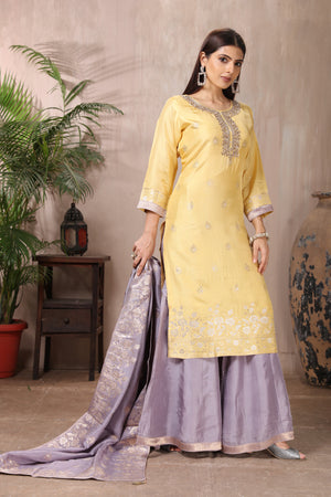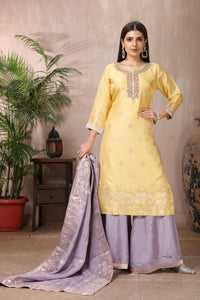 502756 Yellow and Grey Embroidered Silk Suit with Dupatta
