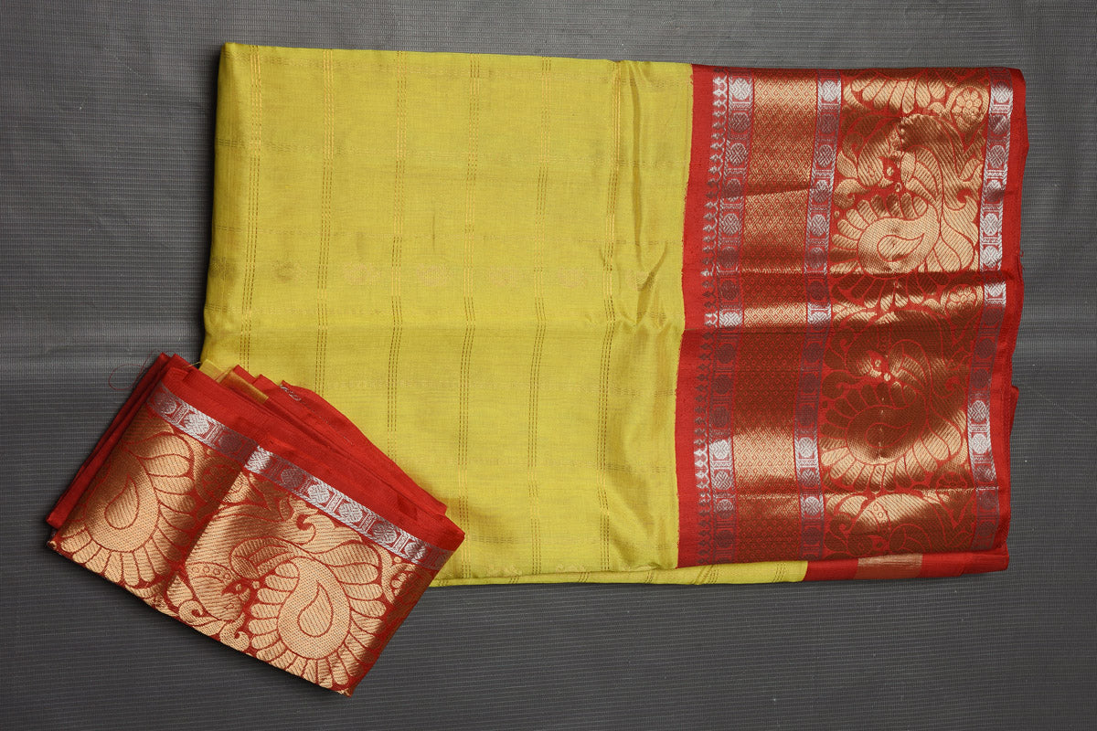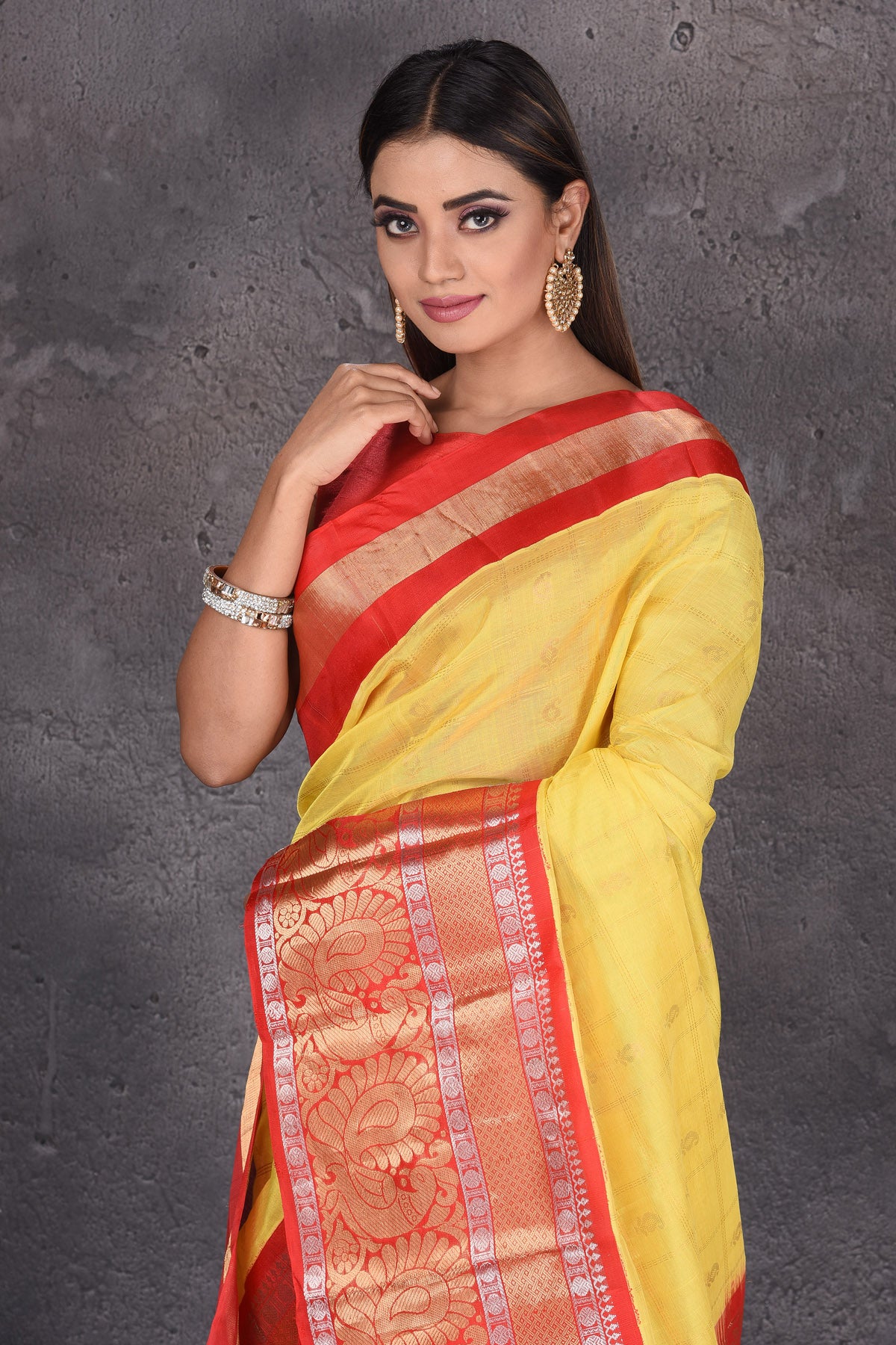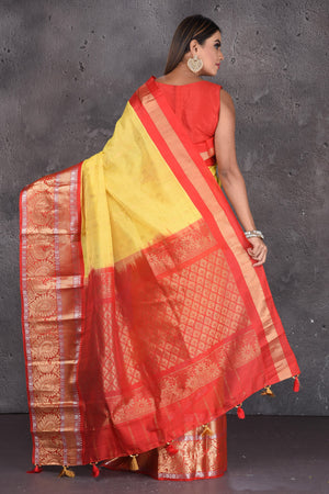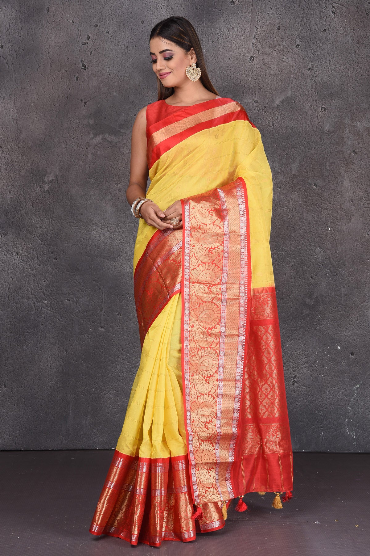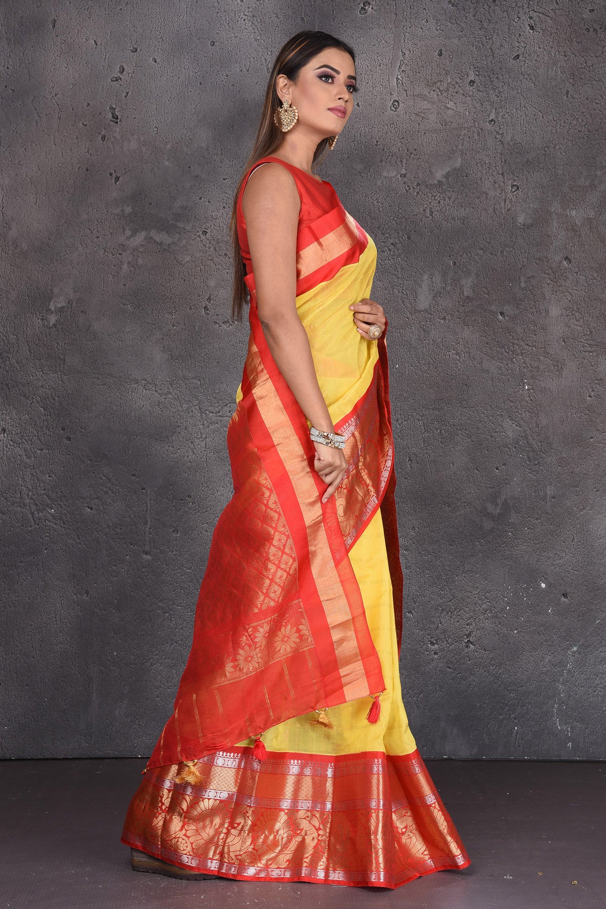 Beautiful yellow Mangalgiri sari is perfect drape for festivals and weddings! The saree has a red zari border and pallu and scattered flower buta. It comes with a matching blouse piece. Shop silk sarees in USA from Pure Elegance.