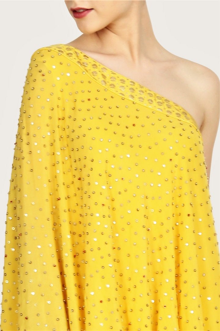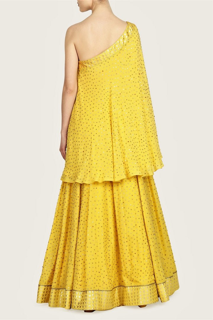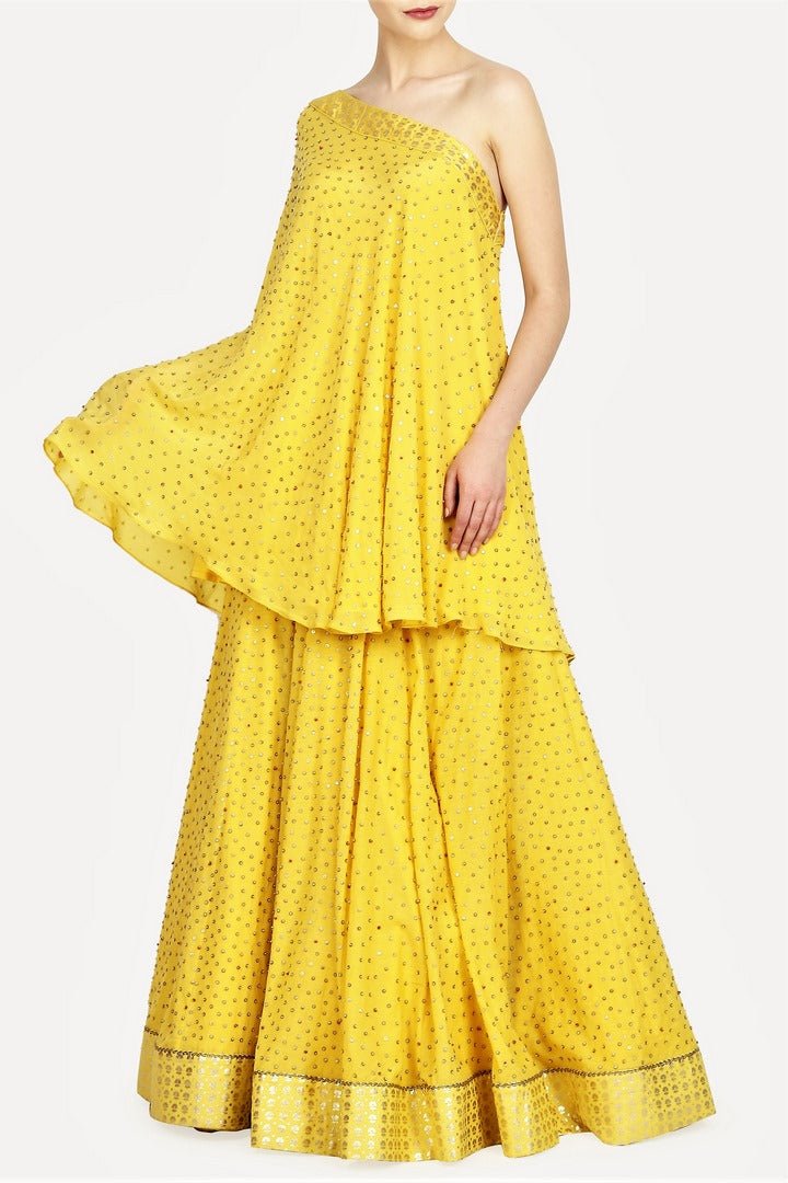 Unleash the diva in you with this yellow one-shoulder crepe top with chita work! It is paired with heavy chita work skirt with gold foil print dupatta and comes with a mukesh net dupatta. Shop online at Pure Elegance or visit our store in USA!