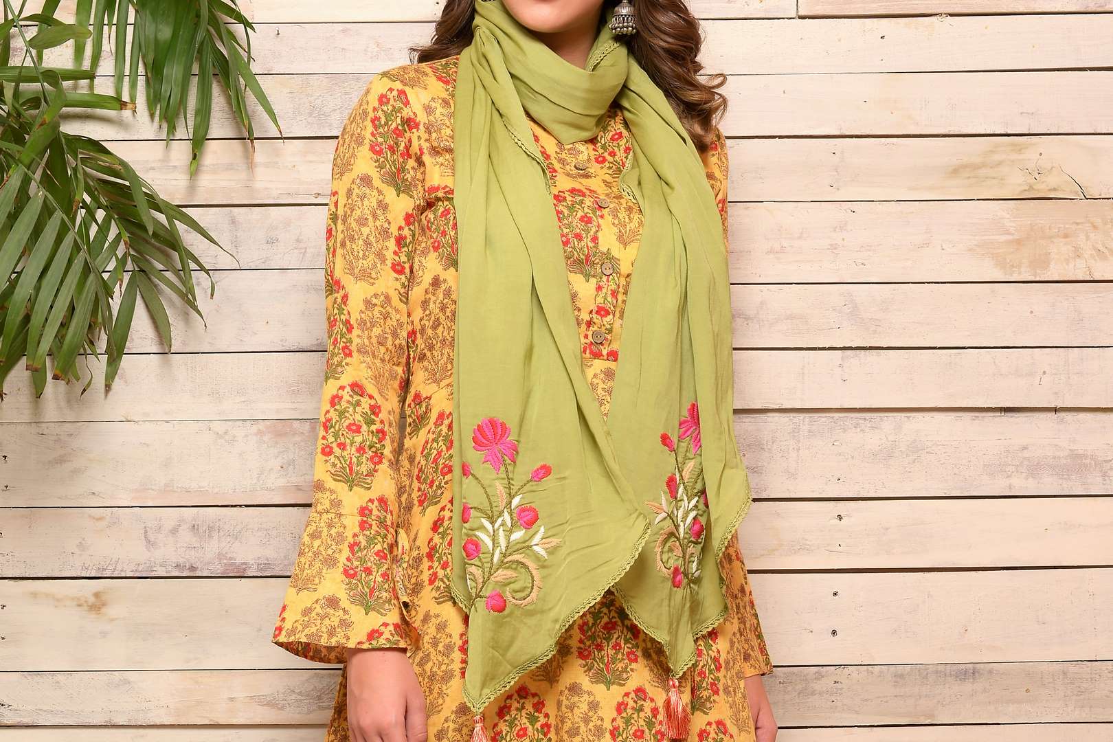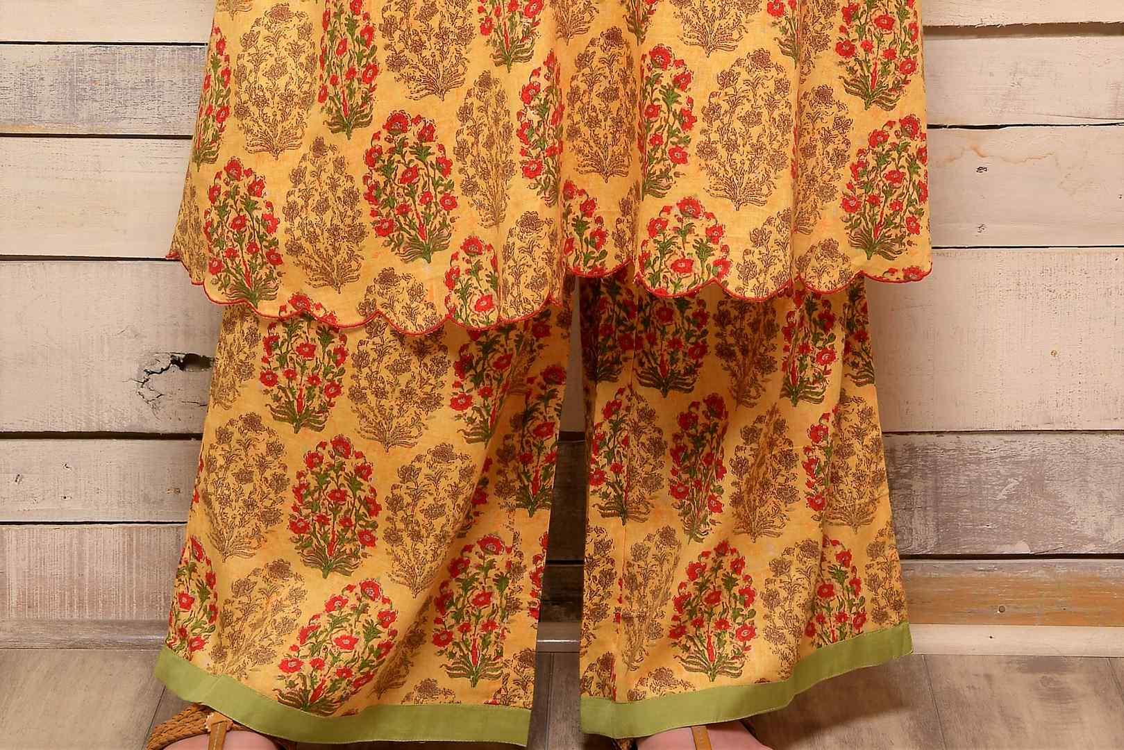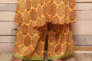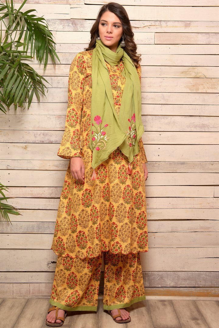 Add spark to your summer style with this yellow color traditional floral buta cotton kurta with matching palazzo from AAS by Aarti Gupta. The suit comes with a green scarf with anchor thread embroidery for a perfect summer layering. Shop online at Pure Elegance or visit our store in USA.