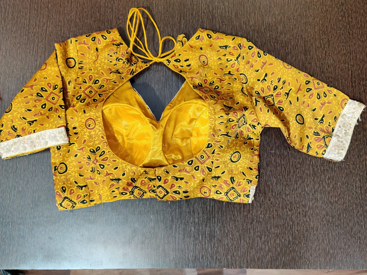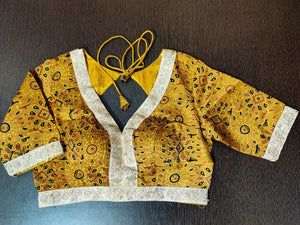 Stunning yellow printed sari blouse with embroidered lace. Shop designer saree blouse online in USA from Pure Elegance.