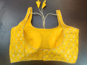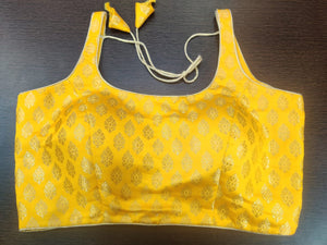 Gorgeous yellow sleeveless readymade Banarasi saree blouse. Buy designer blouse in USA from Pure Elegance.