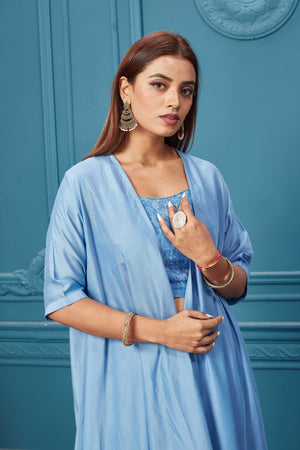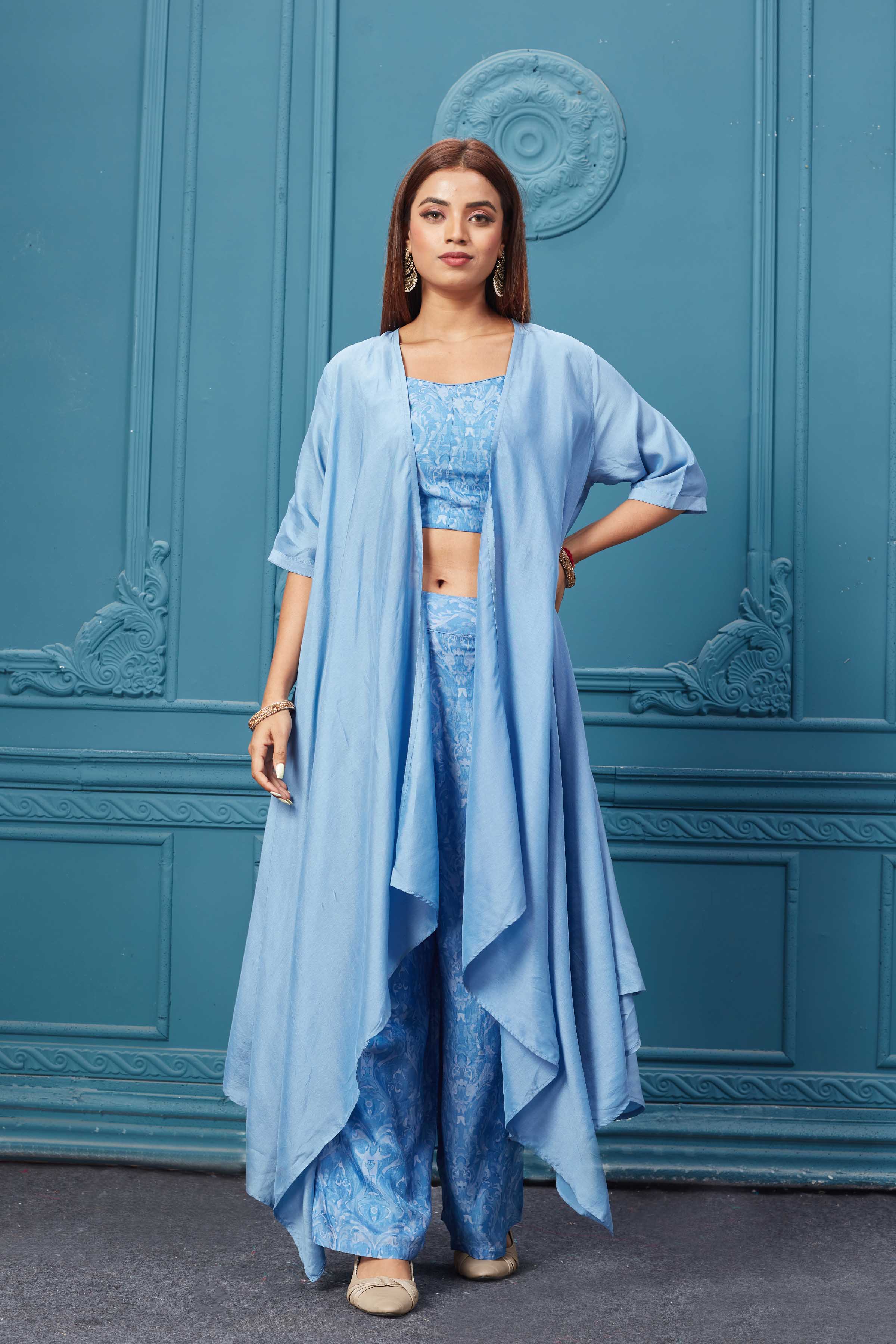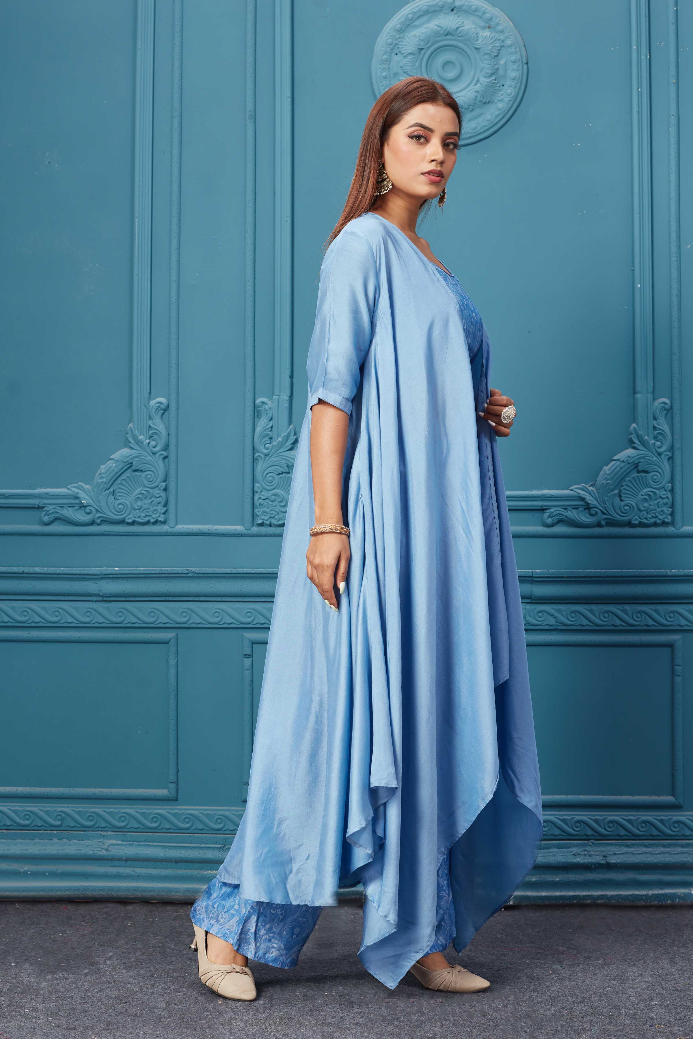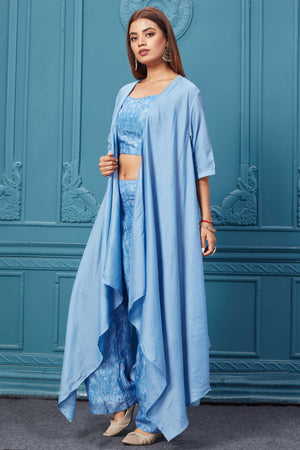 Gorgeous sky blue suit set with embroidery. Featuring beautiful pant, a blouse, and a stylish jacket. Shop online at Pure Elegance or visit our store in the USA.