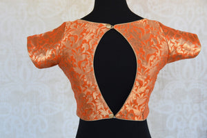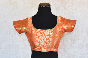 The gorgeous orange and golden blouse has a back slit. The blouse can be paired with any saree to give a classy look.